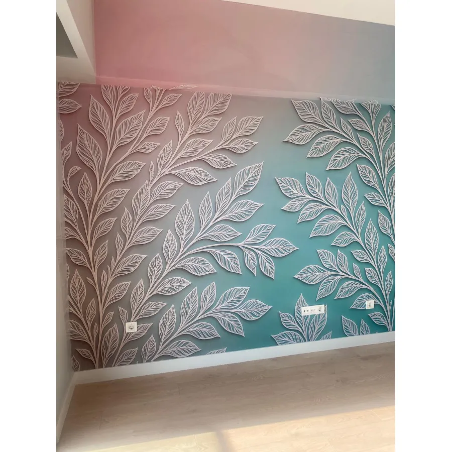 Modern iç mekanlara zarif ve estetik bir dokunuş kazandıran bu dijital duvar kağıdı, üç boyutlu konturlu yaprak desenleriyle dikkat çekiyor. Yumuşak geçişli yeşil ve toprak tonlarındaki arka plan üzerinde yükselen kabartmalı çizgisel yapraklar, duvarda sade ama etkileyici bir sanat eseri görünümü sunuyor. Organik formlar, dekorasyonda doğal bir huzur ve modern bir şıklık arayanlar için ideal bir tercih oluşturuyor.