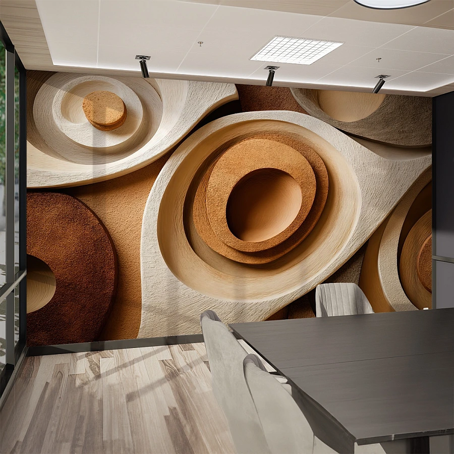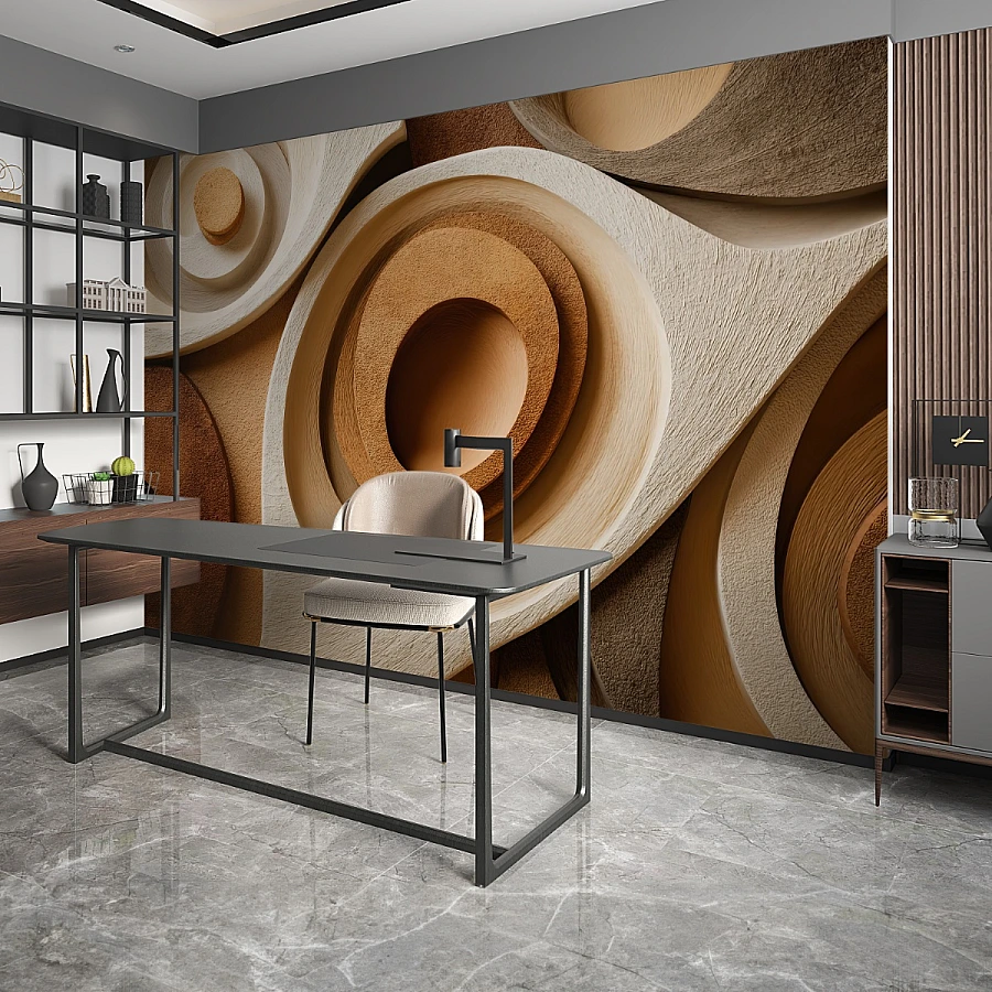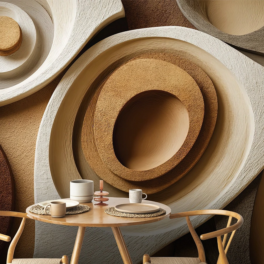 Katmanlı dairesel formlar ve doğal toprak tonlarının güçlü uyumuyla tasarlanan bu 3D soyut duvar kağıdı, mekâna heykelsi bir derinlik kazandırır. Ahşap ve kum dokusunu andıran yüzey geçişleri sayesinde duvar, düz bir zemin olmaktan çıkar ve mimari bir sanat paneline dönüşür.