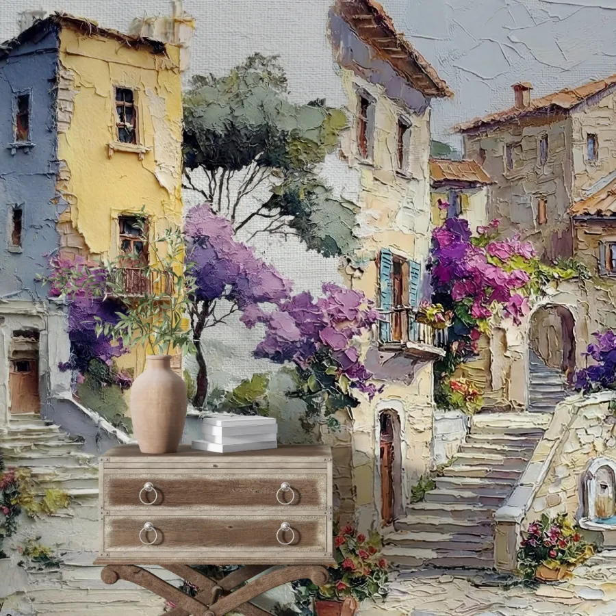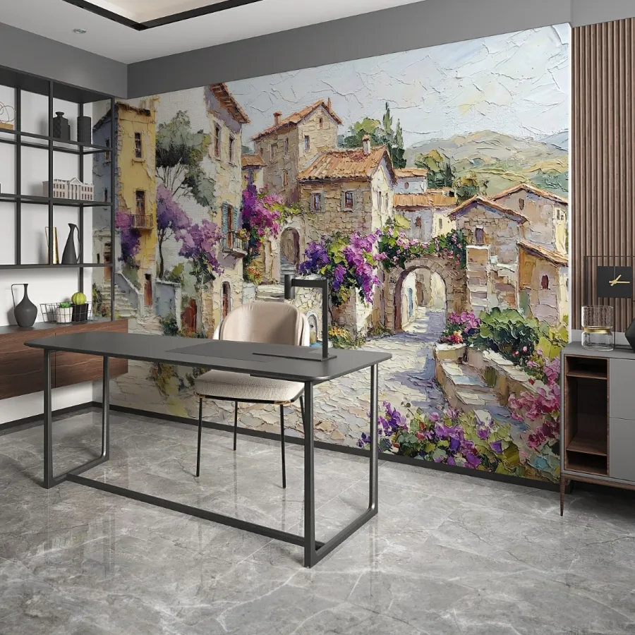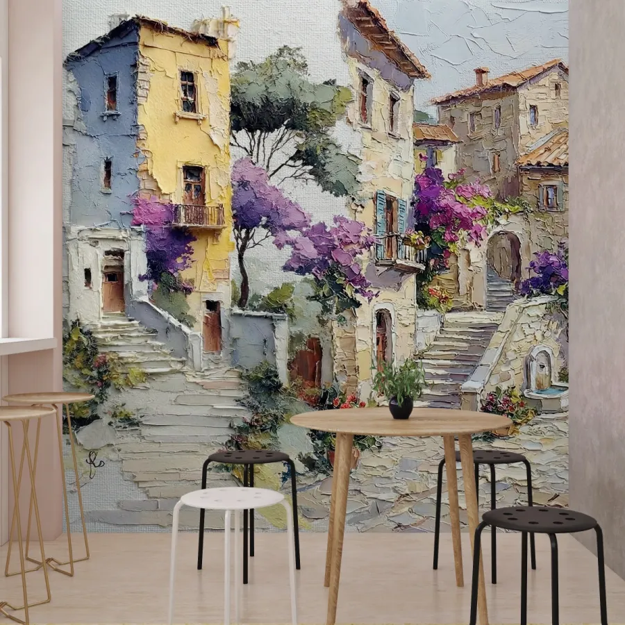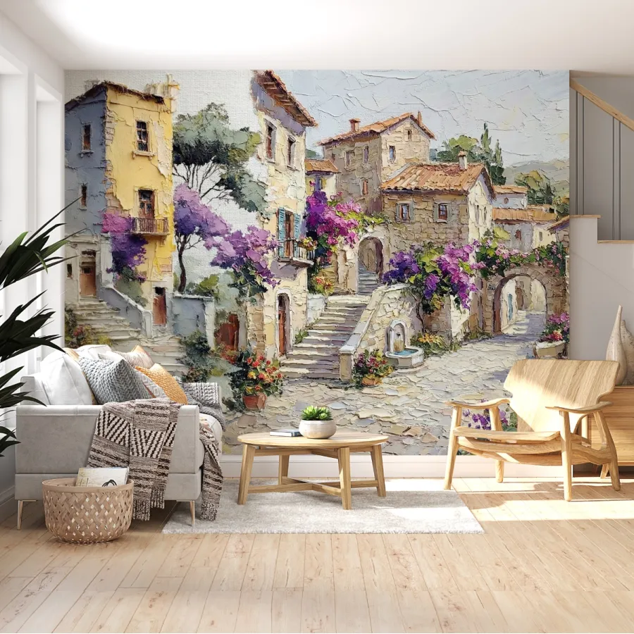 Güneşle yıkanmış taş sokakların dinginliğini duvarlara taşıyan bu sanatsal tasarım, Akdeniz’in zamansız ruhunu resimsel bir dokuyla buluşturuyor. Eski taş evlerin sıcak tonları, mor begonvillerin canlı dokunuşlarıyla birleşerek mekânda romantik ve huzur dolu bir atmosfer yaratıyor.
