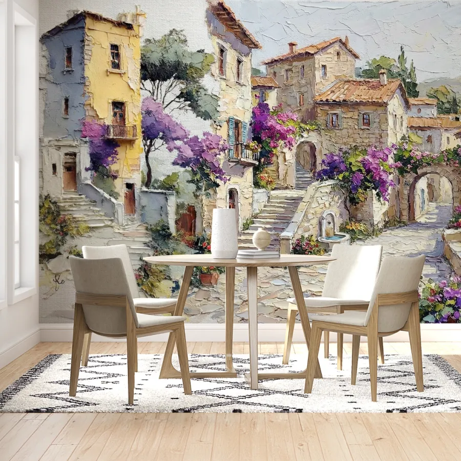 Taş Evleri ve Mor Çiçekler – Sanatsal Dokulu Duvar Kağıdı