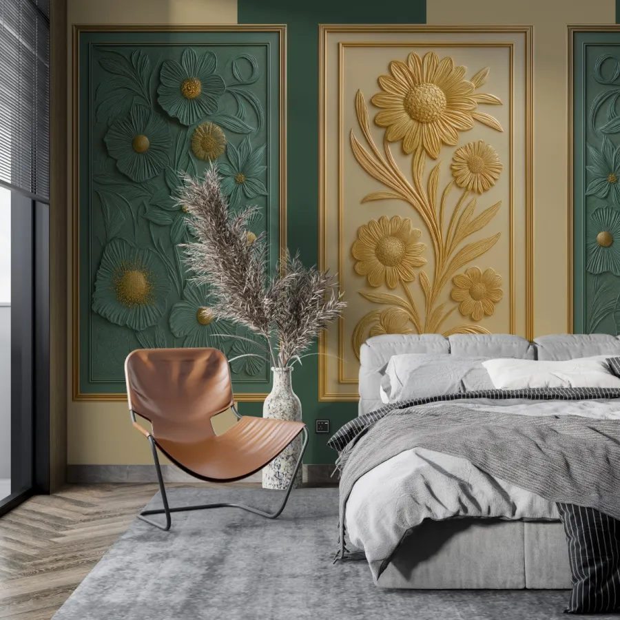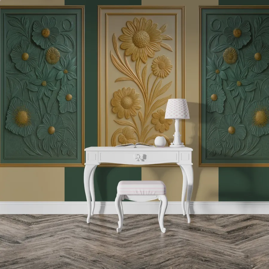 Görkemli bir salon duvarını andıran bu tasarım, altın kabartma çiçek motiflerini zümrüt yeşili zeminle buluşturarak klasik sanatın ihtişamını modern iç mekânlara taşır. Işığa göre farklı tonlar alan bu rölyef etkili yüzey, duvarı bir tablo gibi dönüştürür. Zarafet, güç ve sıcaklığın birleştiği bu kompozisyon; her bakışta derinlik, her dokunuşta lüks hissi uyandırır. Zengin altın detaylar, yeşilin dinginliğiyle birleşerek mekâna asil bir bütünlük kazandırır.