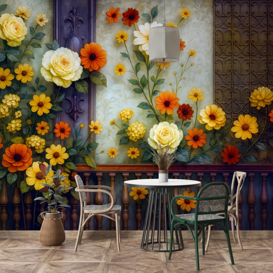 Canlı renk paleti ve klasik detaylarıyla göz kamaştıran bu duvar kağıdı, altın sarısı, turuncu ve şeftali tonlarındaki zarif çiçekleriyle yaşam alanlarınıza sıcak ve enerjik bir karakter kazandırır. Klasik sütun ve parmaklık dokuları, romantik bir duvar mimarisi hissi yaratırken, arka plandaki mavi ve bronz ton geçişleri çiçeklerin canlılığını daha da öne çıkarır. Bu tasarım, doğanın enerjisini klasik bir sanat estetiğiyle harmanlayarak mekânlara hem zarif hem neşeli bir hava katar.