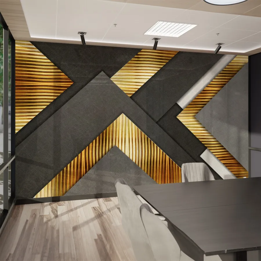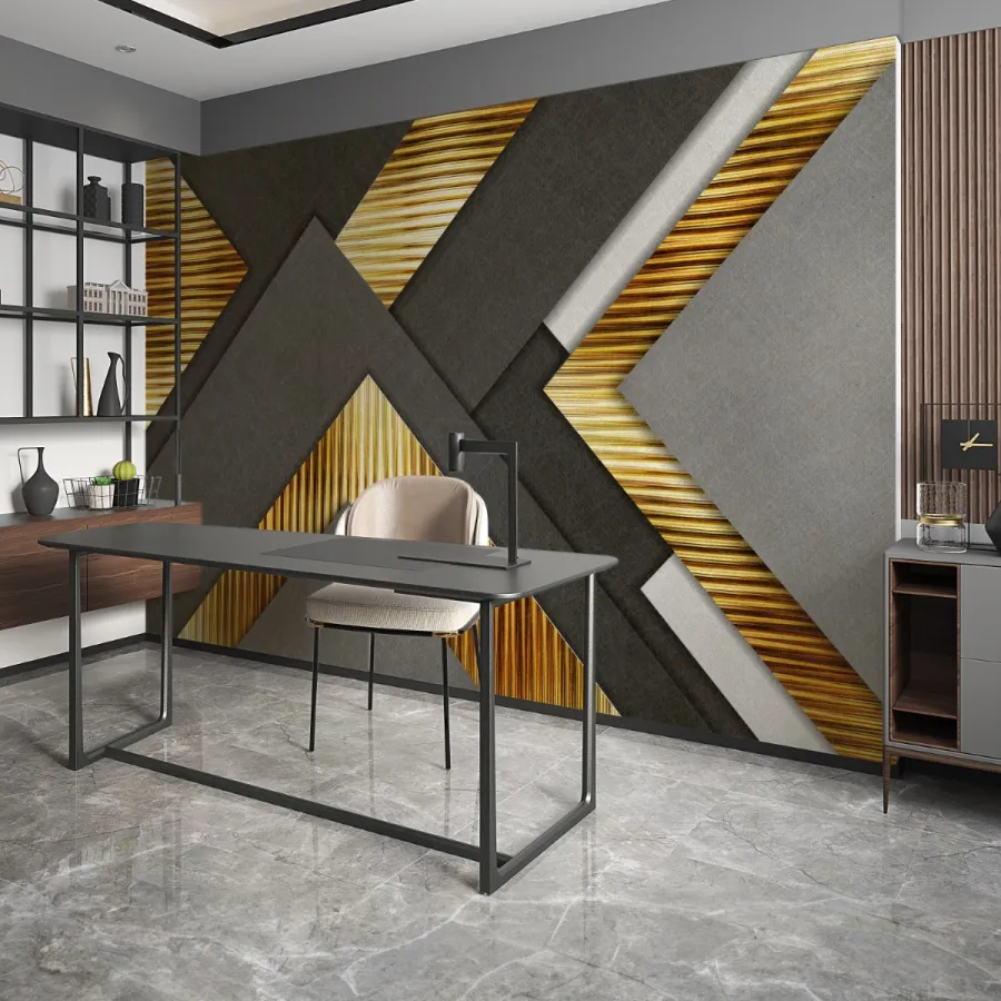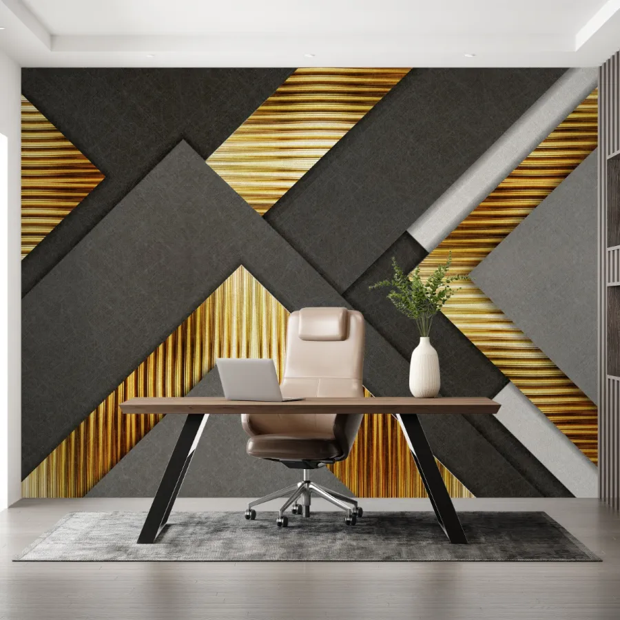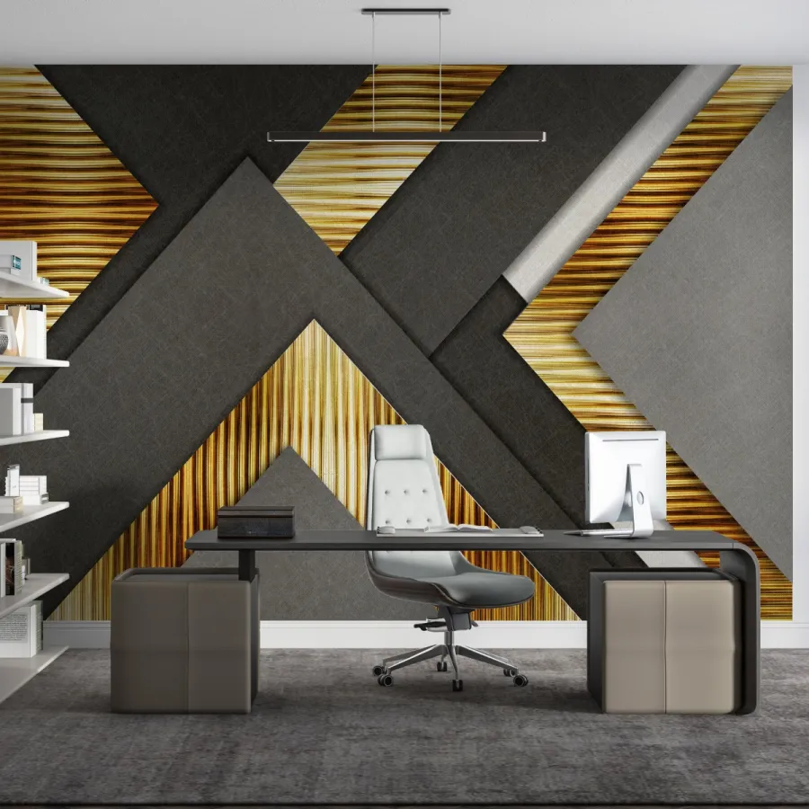 Modern mimariden ilham alan bu lüks duvar kağıdı, mat antrasit yüzeyler ile metalik altın dokuların etkileyici kontrastını bir araya getirir. Katmanlı geometrik desen yapısı, duvarlara güçlü bir hacim ve derinlik hissi kazandırırken; altın tonlarının yansıması mekâna sofistike bir ışıltı katar. Ofis, yönetici odası veya modern yaşam alanlarında prestijli bir atmosfer yaratan bu tasarım, güç ve estetiği aynı anda hissettiren çağdaş bir sanat eseri gibidir.