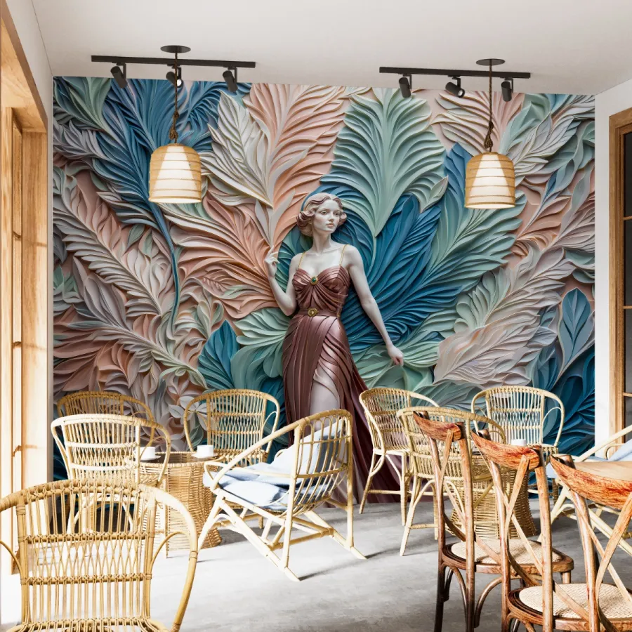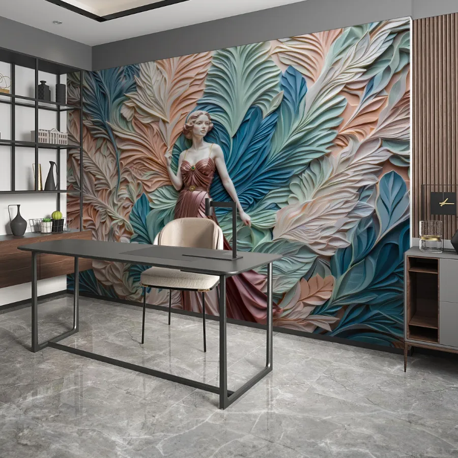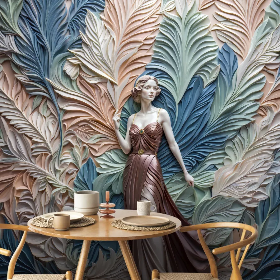 Zarif bir art-deco tanrıçanın heykelsi duruşunu, kabartma etkili soyut yaprak dokularıyla birleştiren bu duvar kağıdı; mekâna anında sahne büyüsü katan, derinlikli ve üst düzey bir estetik sunar. Kehribar, gül kurusu, petrol mavisi ve soft yeşil tonlarının birlikte oluşturduğu görsel armoni; mekâna hem romantik hem de modern bir lüks atmosfer kazandırır.