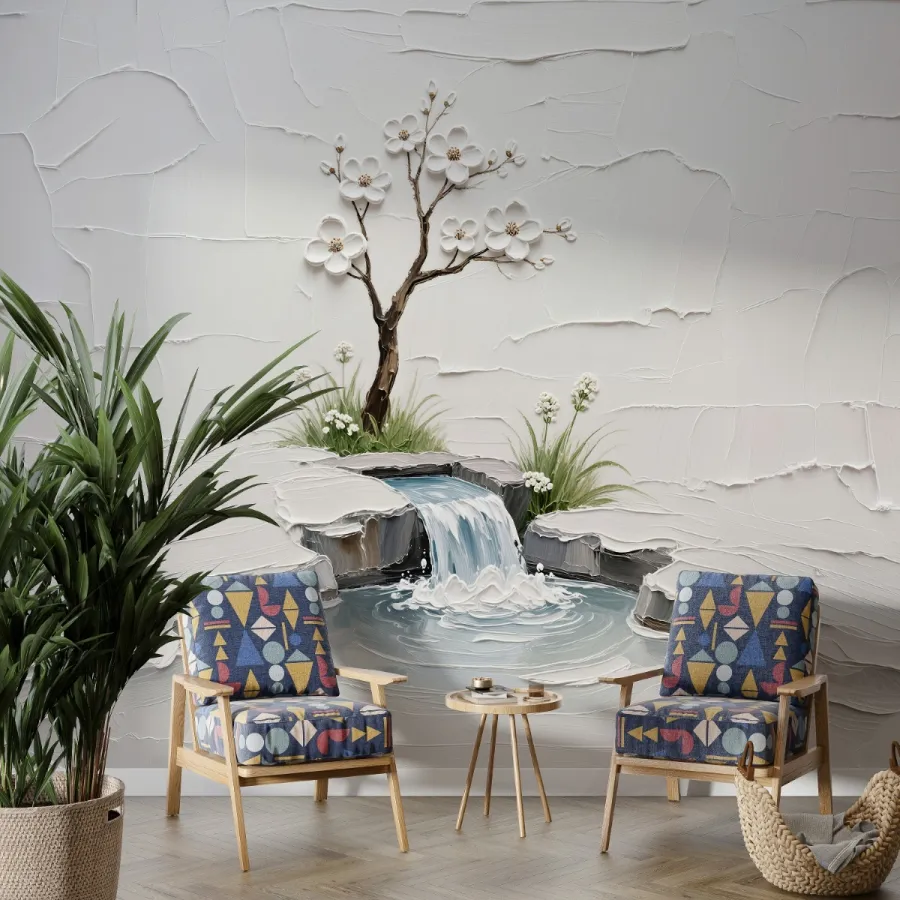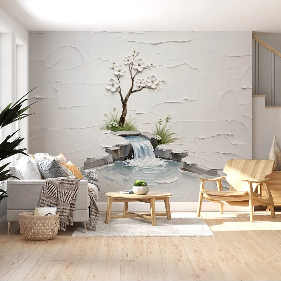 Beyaz Çiçekler ve Şelale – Kabartma Dokulu Huzurlu Doğa Duvar Kağıdı