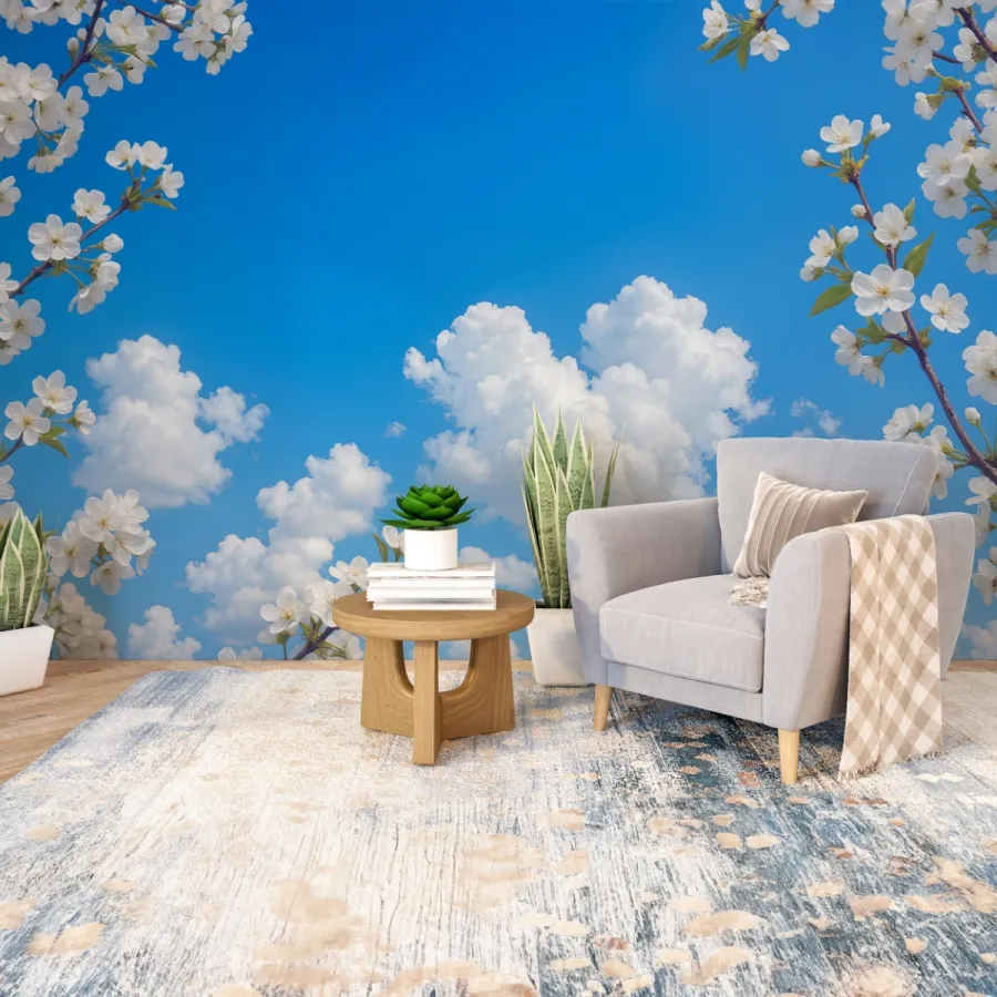 Bulutlu Gökyüzü ve Beyaz Çiçek Dalları Temalı 3D Duvar Kağıdı