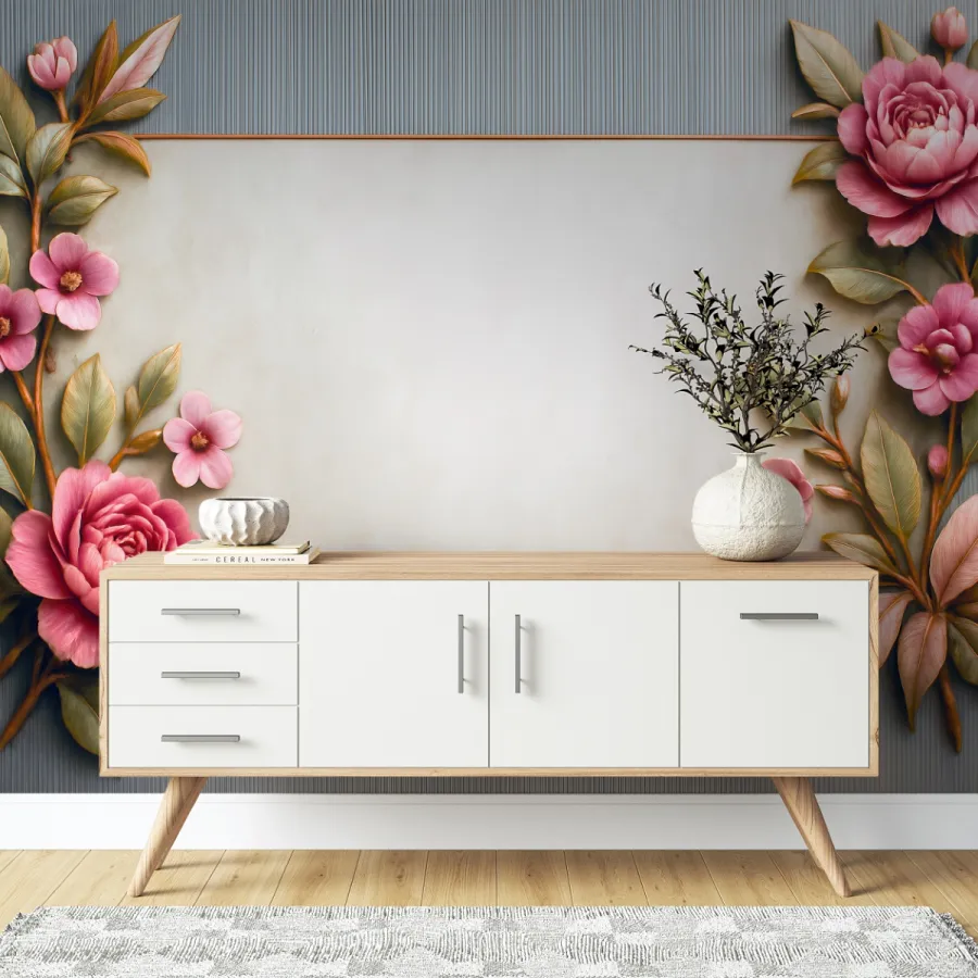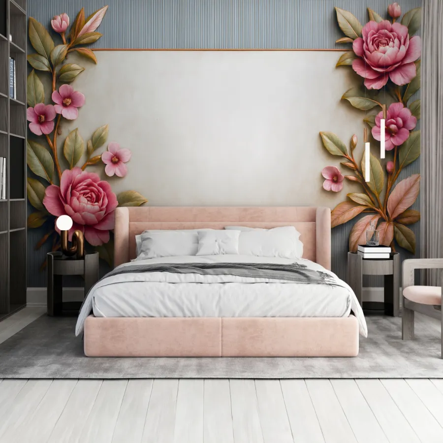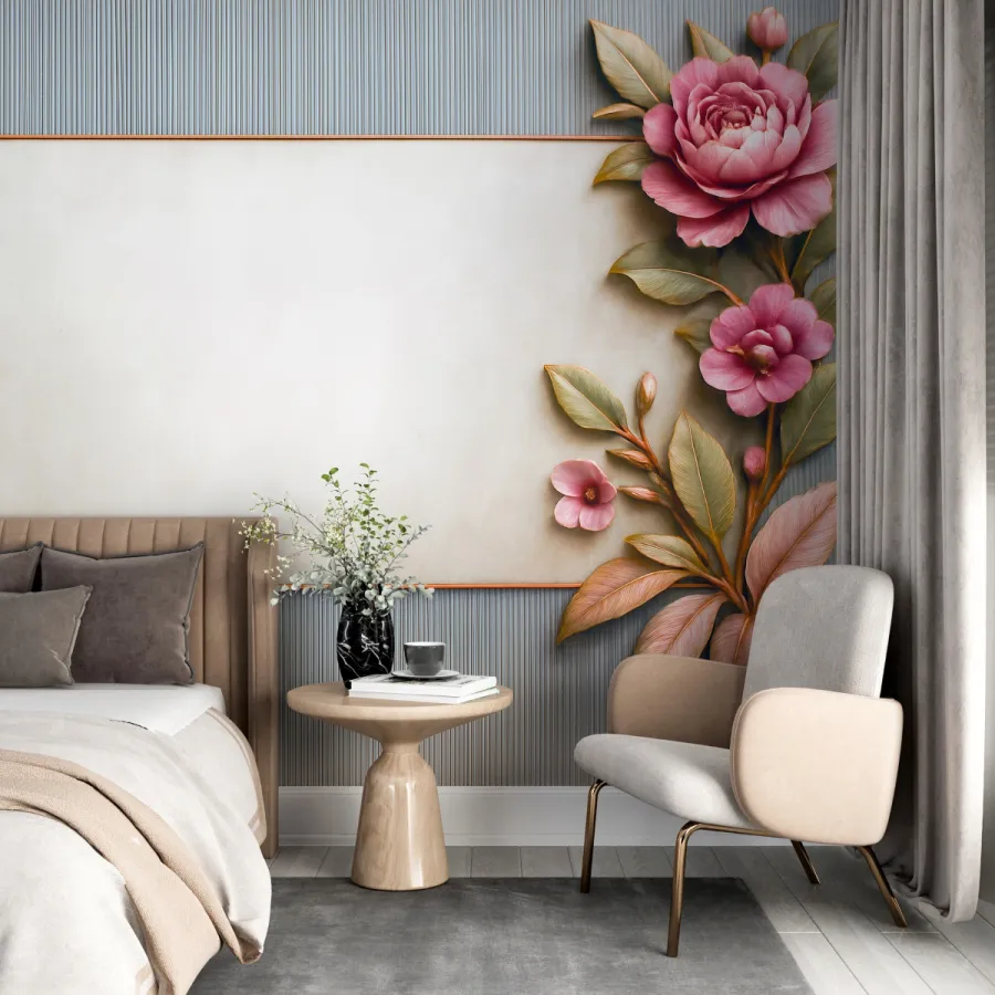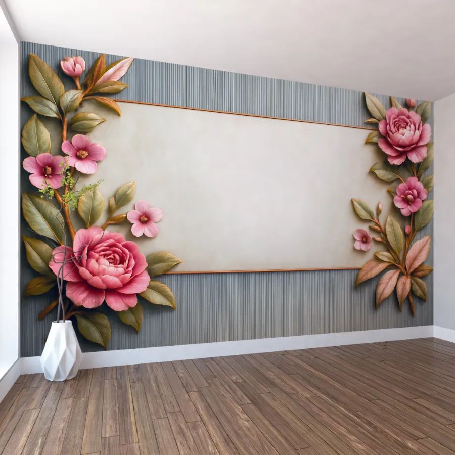 Yumuşak pembe güllerin romantik zarafeti, ince altın çerçeveyle birleşerek bu tasarımda duvarları adeta bir sanat panosuna dönüştürüyor. Doğal yaprak tonları ve kabartma hissi veren floral detaylar, mekâna sakin ama etkileyici bir estetik kazandırıyor.