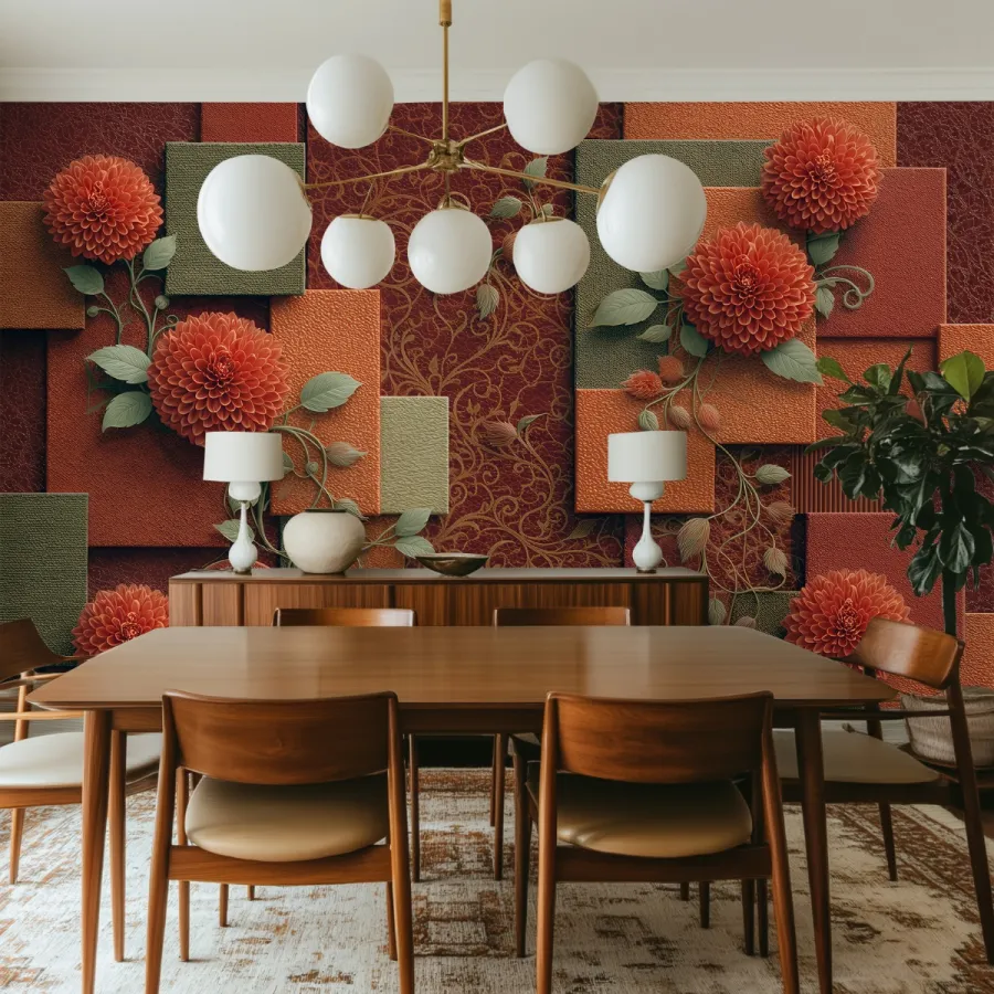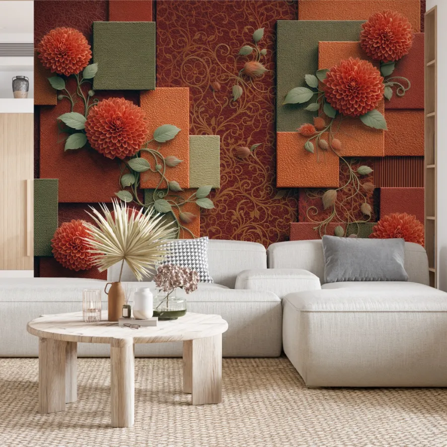 Çiçek Paneller – Terracotta & Zeytin Yeşili 3D Dekoratif Duvar Kağıdı