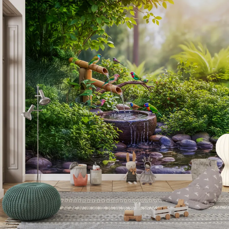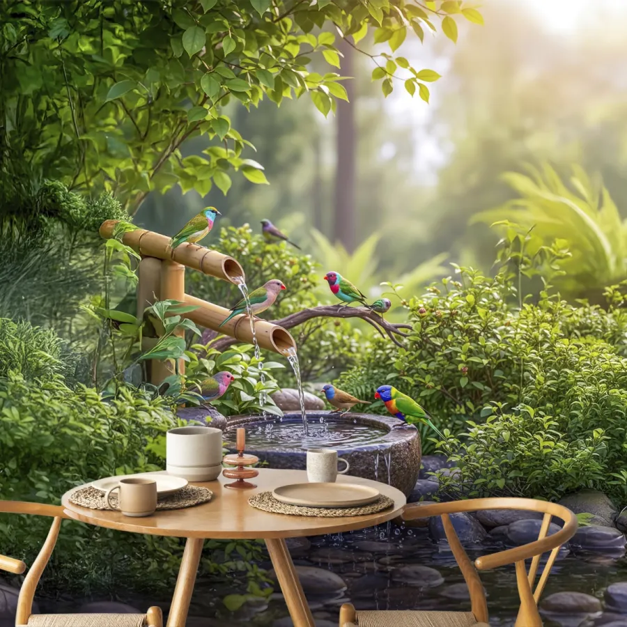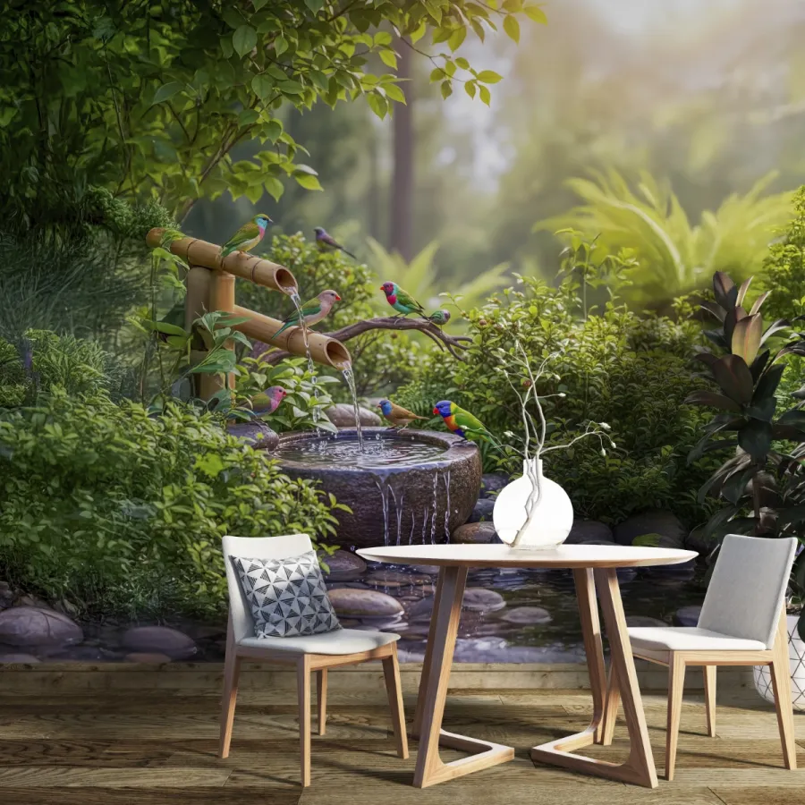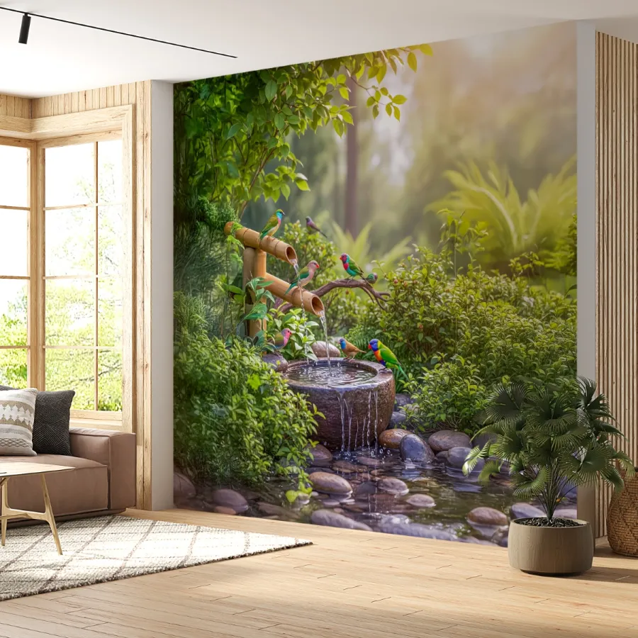 Doğanın en huzurlu anlarından birini yansıtan bu 3D duvar kağıdı, bambu çeşmelerden akan suyun sakinliğini ve renkli kuşların canlılığını bir araya getirir. Yumuşak ışık geçişleriyle aydınlanan sahne, duvarlarda gerçek bir doğa penceresi etkisi yaratır. Her detayıyla doğanın melodisini hissettiren bu tasarım, iç mekâna huzur, canlılık ve zarafet kazandırır. Bahçe atmosferini evinizin kalbine taşıyan bu sahne, özellikle rahatlatıcı ve pozitif enerji dolu bir alan yaratmak isteyenler için idealdir.