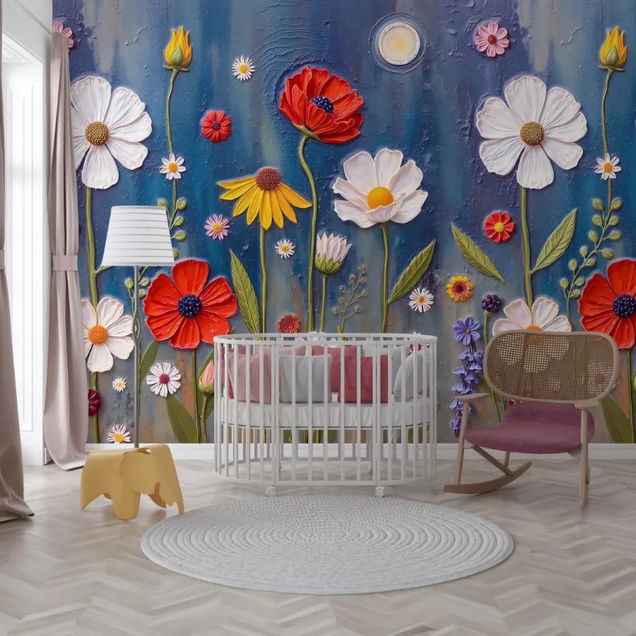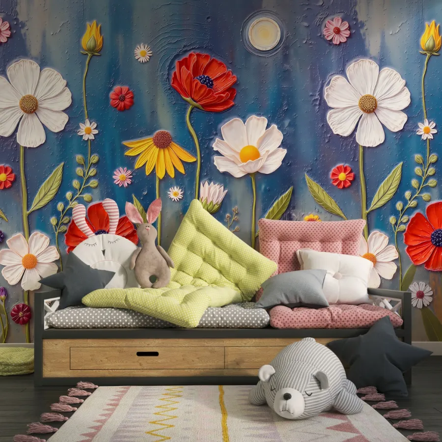 Kabartma dokulu büyük papatyalar, gelincikler ve sarı–turuncu çiçekler sanki ay ışığında açıyormuş gibi duvarda parlıyor. Çiçeklerin arasında dolaşan küçük detaylar, çocukların hayal gücünü besleyen masalsı bir oyun alanı yaratıyor.