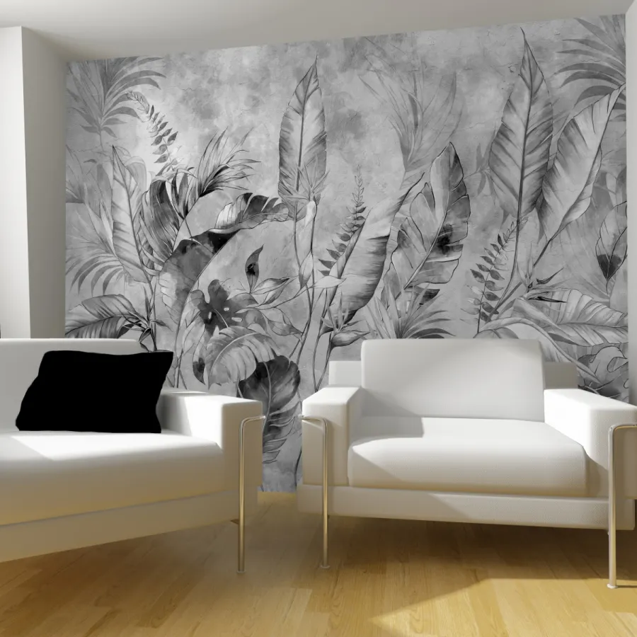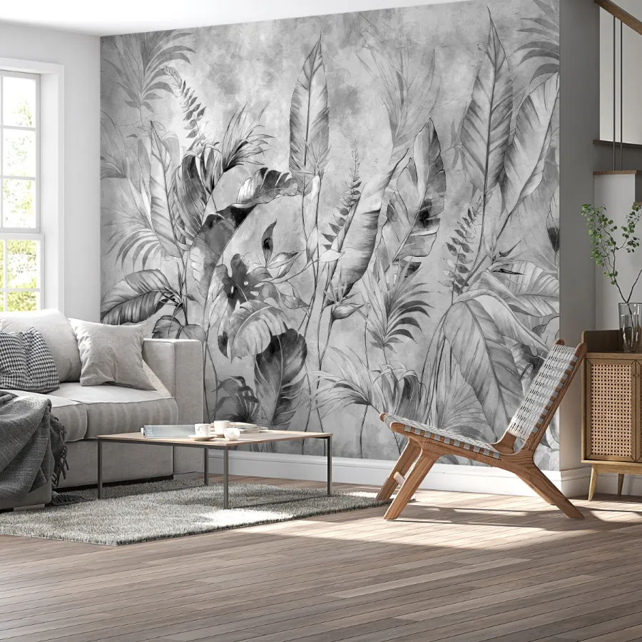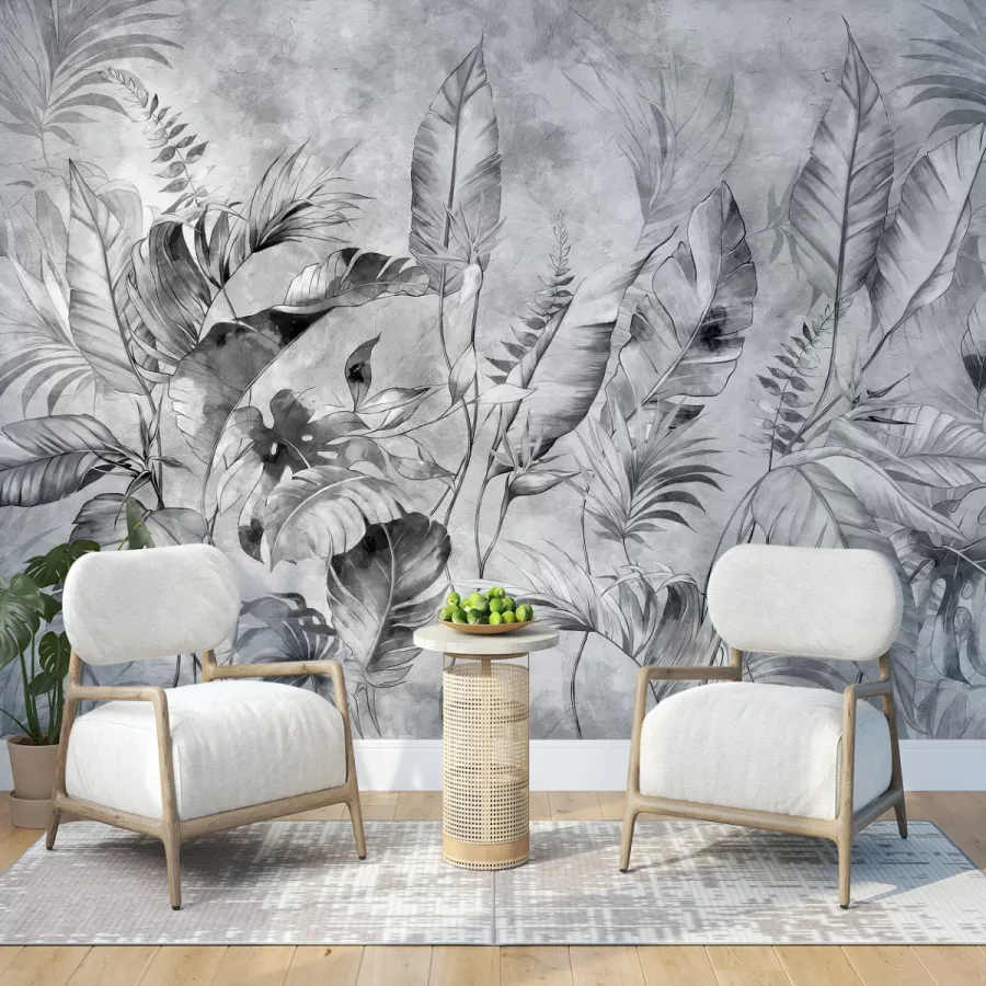 Sisli bir sabahın dinginliğini duvarlara taşıyan bu zarif tasarım, gri tonların sofistike geçişleriyle oluşturulmuş tropikal yaprakları adeta bir suluboya tablosu gibi sunuyor. Katman katman açılan yaprak siluetleri, hem modern hem de doğal bir atmosfer yaratırken mekâna şiirsel bir sakinlik katıyor.