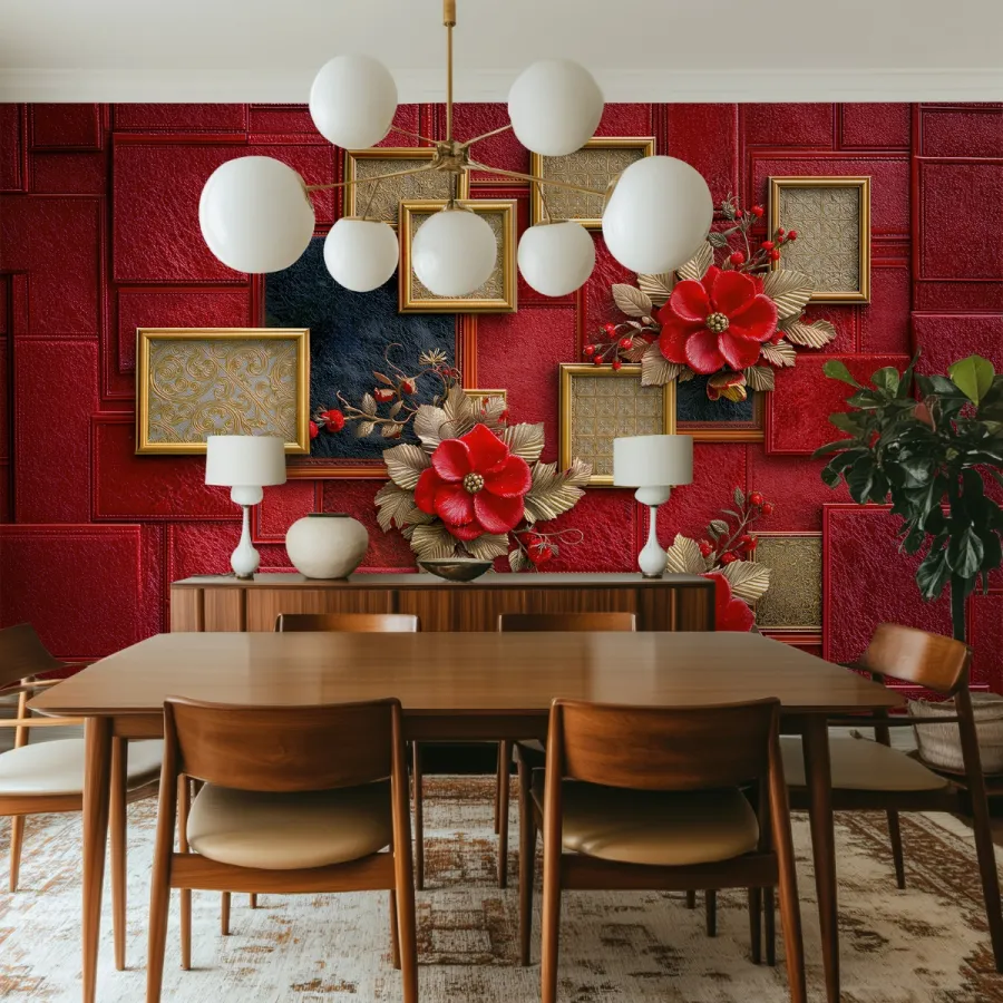 Bu tasarım, derin kırmızı kadife dokulu panelleri, altın çerçeveli geometrik formlar ve heykelsi çiçek kompozisyonlarıyla birleştirerek mekânda güçlü ve çarpıcı bir atmosfer yaratır. Zengin kırmızı zemin, altın detayların ışıltısını ön plana çıkarırken; kabartmalı çiçek ve yaprak figürleri duvara sanatsal bir derinlik kazandırır.