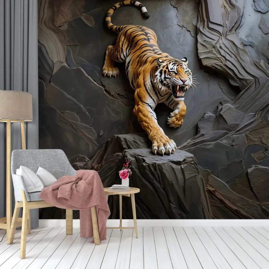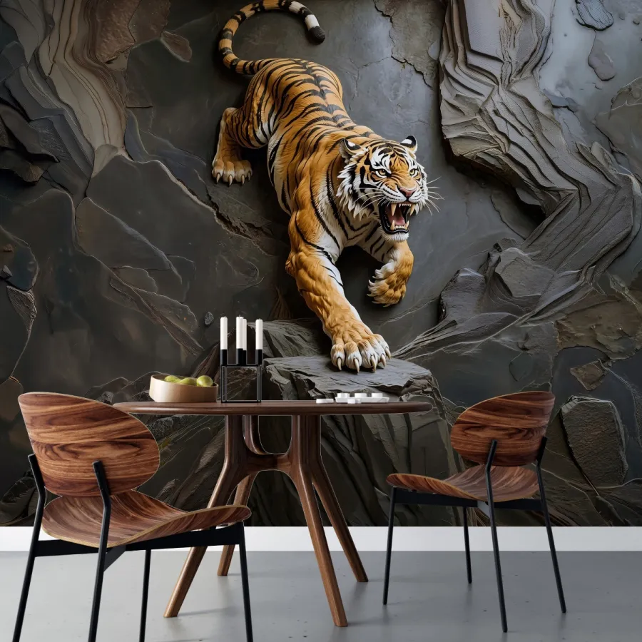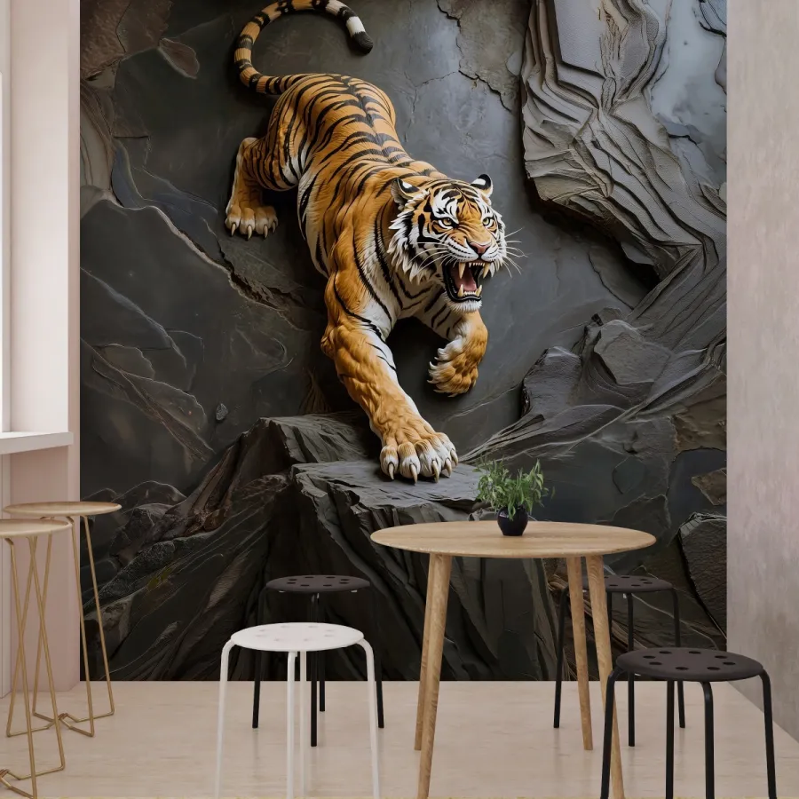 Kasları gerilmiş, pençeleri zemine saplanmaya hazır, hırlayışı duvarın içinden geliyormuş gibi yankılanan vahşi bir kaplan… Bu tasarımın kabartma dokusu, kaplanın vücudundaki her çizgiyi ve her gölgeyi inanılmaz bir gerçeklikle hissettirir.