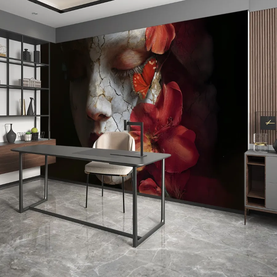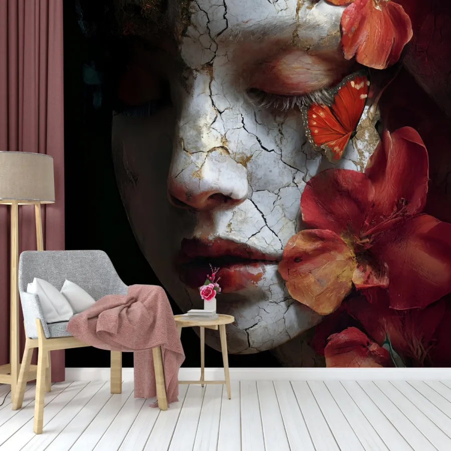 Sanatın en etkileyici yüzlerinden biriyle karşı karşıyasınız: kırılgan bir yüzeyin altından yükselen duyguların görsel bir manifestosu. Bu dramatik duvar kağıdı, porselen bir yüzün çatlak dokularıyla kırmızı çiçeklerin tutkusunu bir araya getirir. Dingin bir yüz ifadesiyle derin bir melankoli yansıtan portre, kırmızı tonların sıcaklığıyla birleşerek hem hüzünlü hem büyüleyici bir atmosfer yaratır. Göz kenarına konmuş bir kelebek, yaşamın inceliğini ve yeniden doğuşun umudunu simgeler. Bu tasarım, duvarlarınızı bir sanat galerisinin merkezine dönüştürür.
