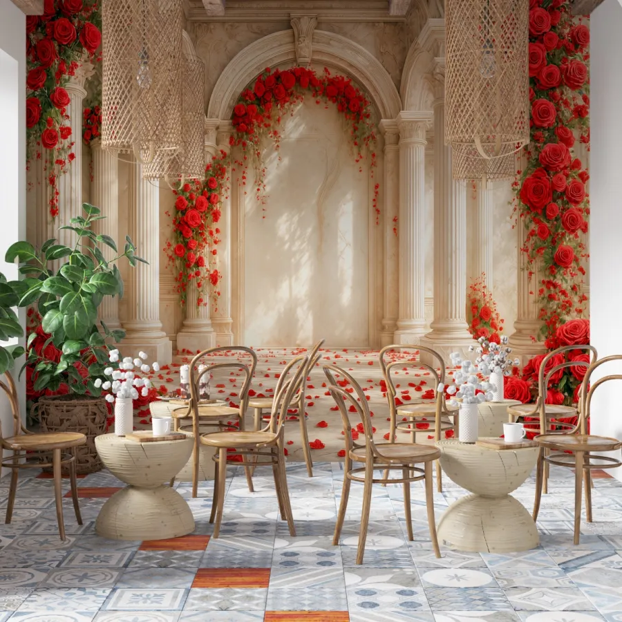Etiketler: romantik, gül, kırmızı, klasik, sütun, barok, lüks, kafe, salon, dekoratif, düğün