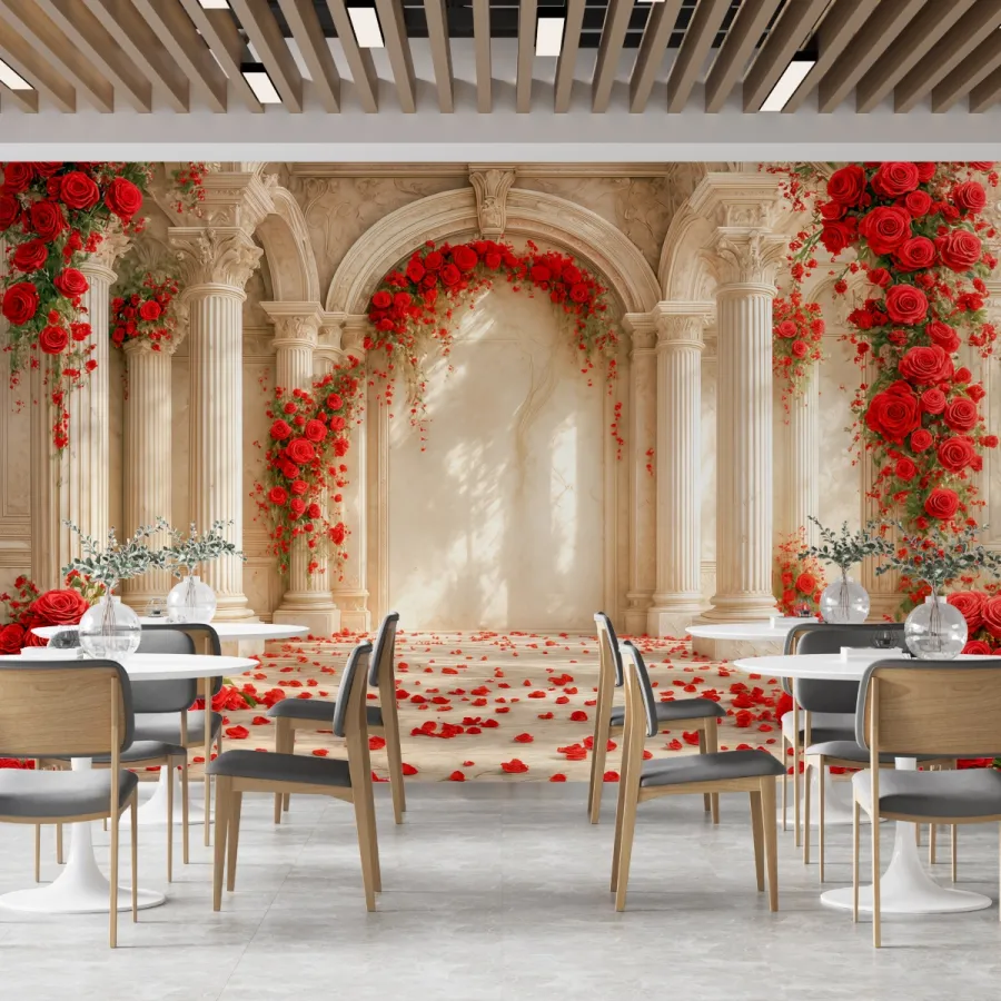 Klasik mimarinin zarafetini ve kırmızı güllerin tutkusunu buluşturan bu duvar kağıdı, her mekânda romantik bir ihtişam yaratır. Mermer tonlarındaki sütunlar ve kemerlerle çevrili bu sahne, kırmızı gül yapraklarının düşsel güzelliğiyle birleşerek bir masal atmosferi oluşturur. Altın ışıltılı detaylar, gün ışığında yumuşak bir parıltı verirken; duvarınıza adeta bir sanat eseri zarafeti kazandırır. Bu tasarım, duygusal bir derinlik ve zamansız bir estetik arayanlar için ideal bir dekorasyon ifadesidir.