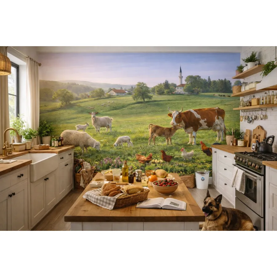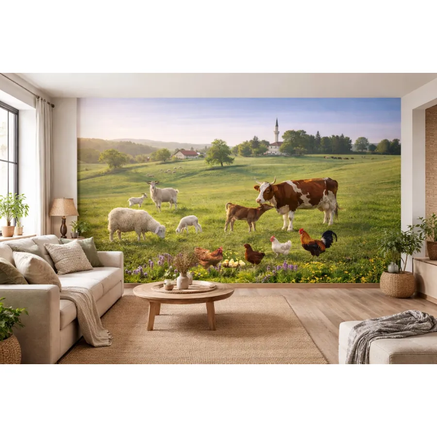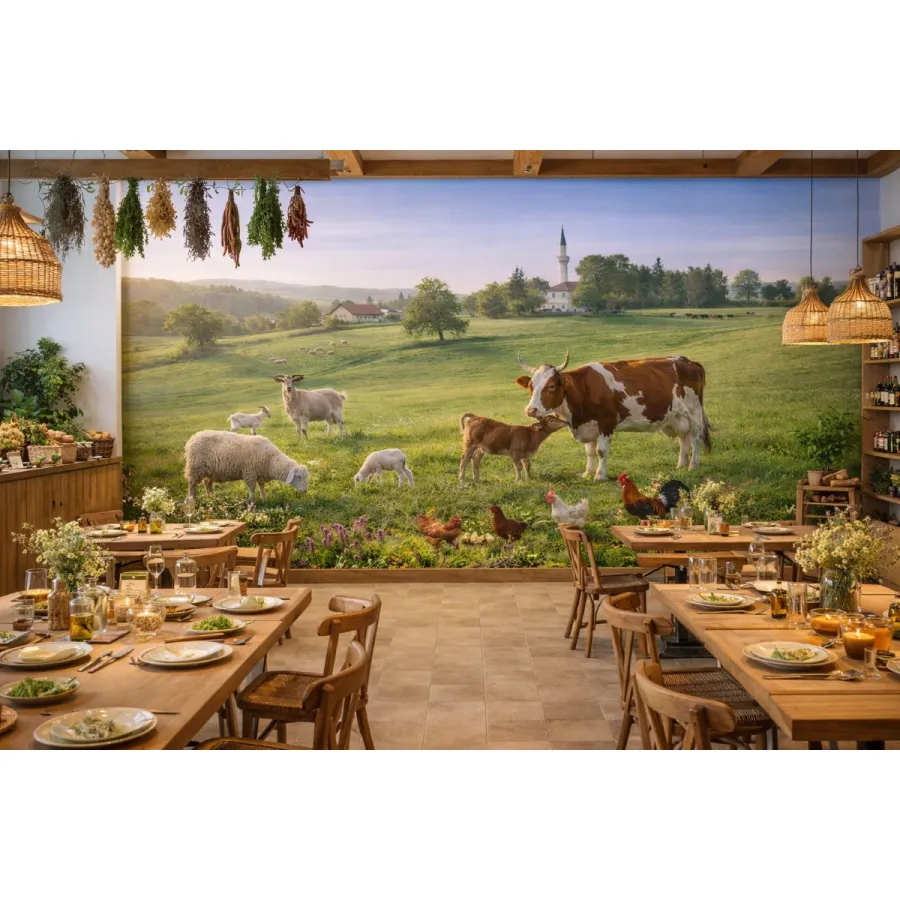 Geniş yeşil çayırların huzurunu ve Anadolu’nun dingin kırsal yaşamını duvarlara taşıyan bu etkileyici tasarım, doğayla iç içe bir yaşam sahnesini adeta pencere gibi mekâna açıyor. Otlayan inekler, koyunlar, kuzular ve tavuklar; sakin bir günün ritmini, samimi ve sıcak bir atmosferle yansıtıyor.