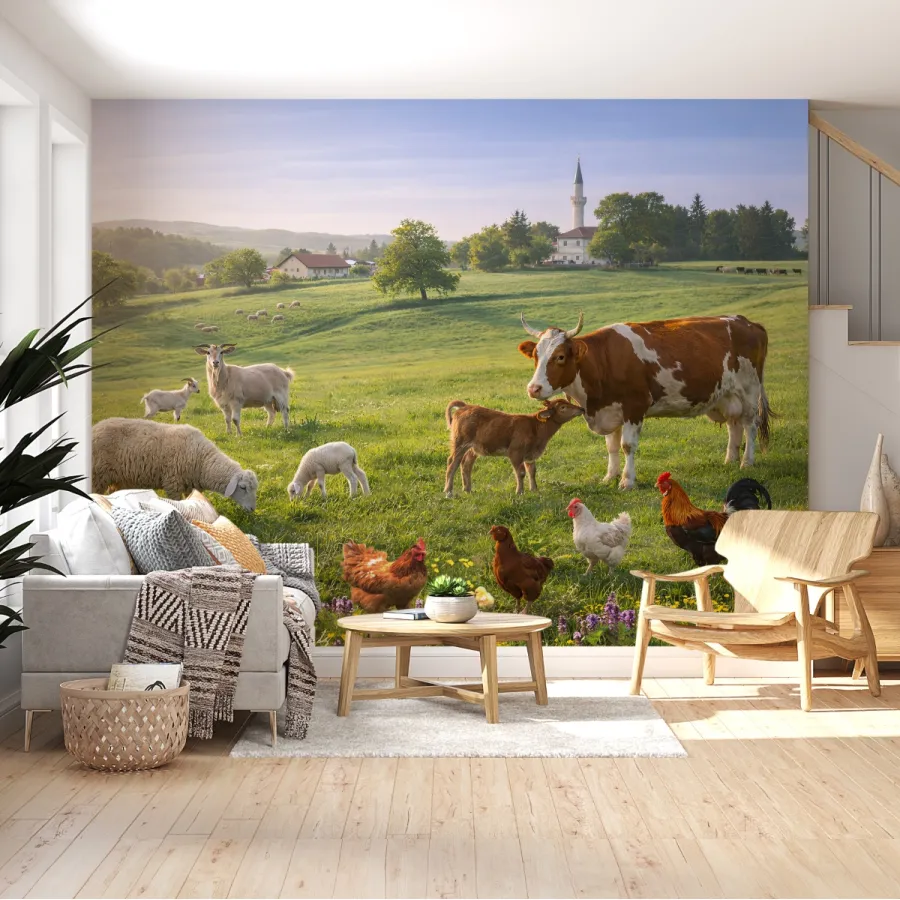 Yumuşak gün ışığıyla aydınlanan pastoral manzara, mekânda ferahlık hissi yaratırken izleyeni şehirden uzak, doğal bir yolculuğa davet ediyor. Gerçekçi detayları ve derinlik hissi sayesinde bu duvar kağıdı, bulunduğu alanda doğal yaşamın sakinliğini ve güven veren karakterini güçlü biçimde hissettiriyor.