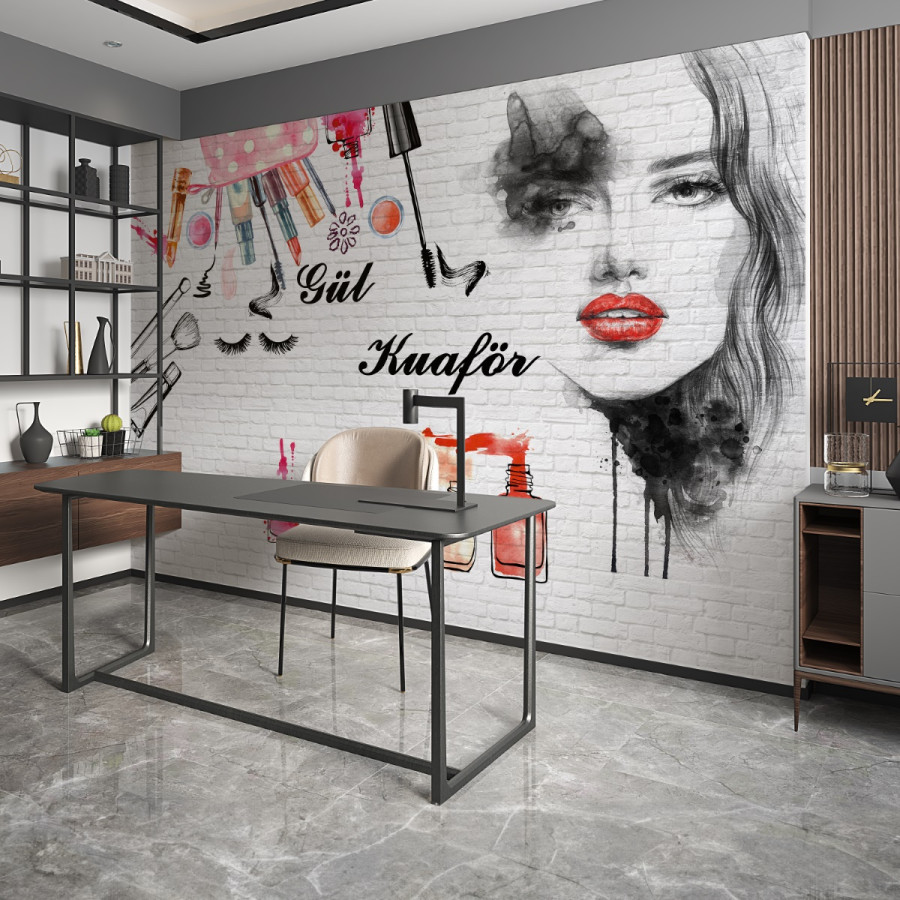 Kuaför ve güzellik salonları için özel olarak tasarlanmış bu canlı duvar kağıdı, makyaj malzemeleri ve stilize edilmiş kadın yüzü çizimleriyle dikkat çekiyor. Beyaz tuğla arka plan üzerine yerleştirilen bu şık tasarım, salonunuza modern ve enerjik bir hava katar. Üzerindeki yazı, müşteri isteğine göre kişiselleştirilebilir, bu sayede işletmenizin adı ya da özel mesajınız duvarda sergilenebilir. Özellikle kozmetik ve güzellik alanlarında hizmet veren mekanlar için mükemmel bir dekorasyon tercihi.