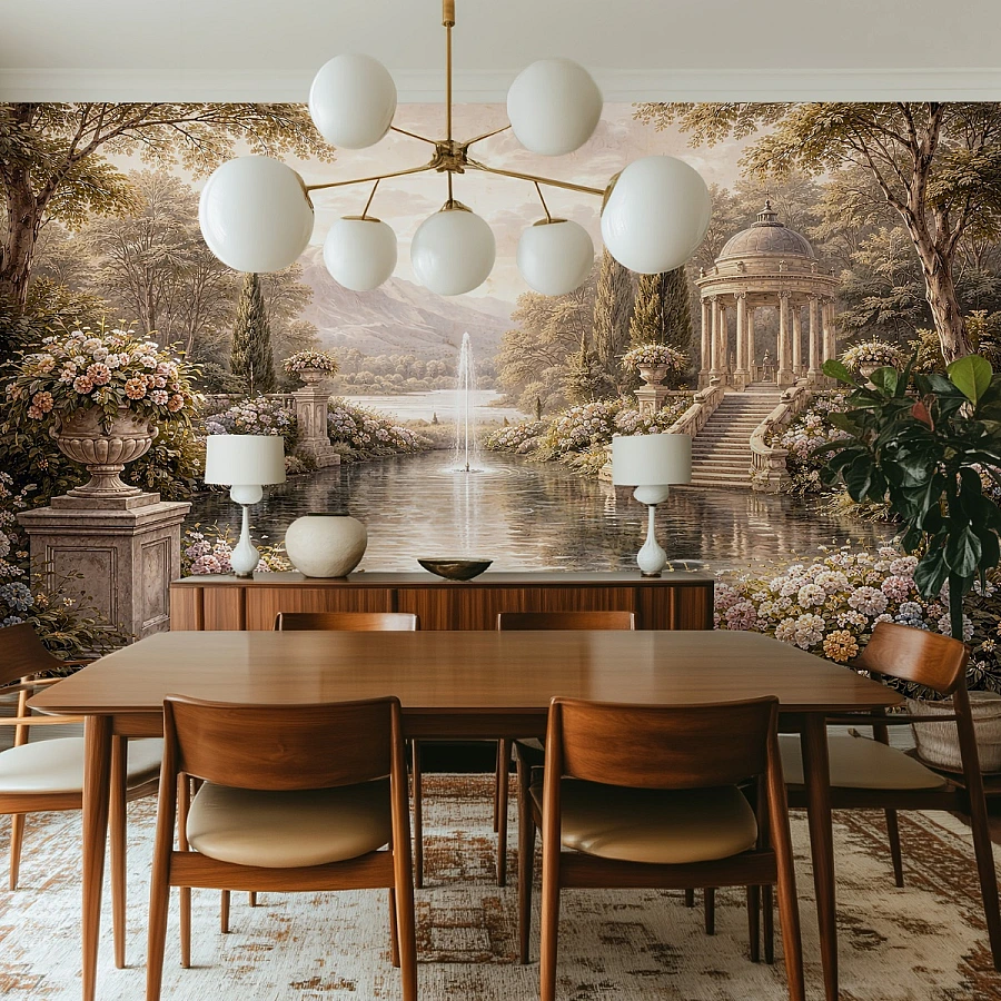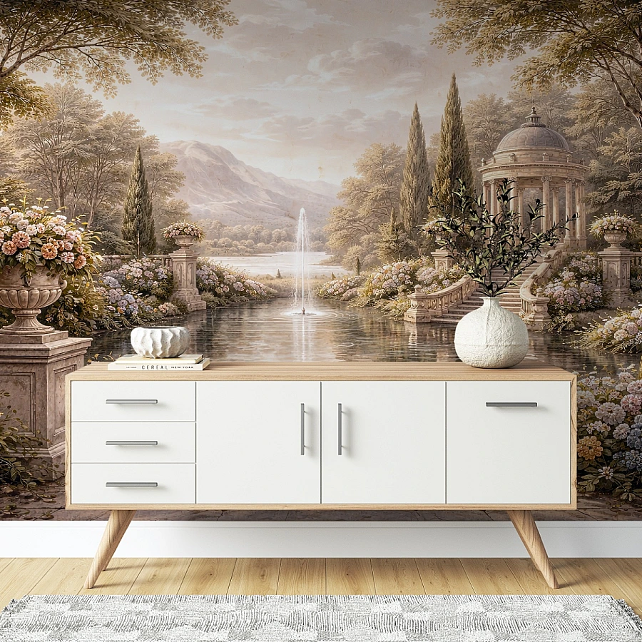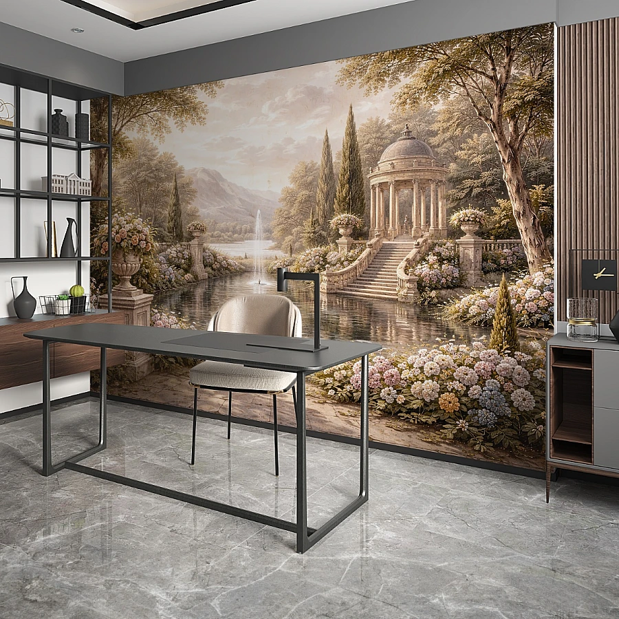 Romantik bir Avrupa saray bahçesinin ihtişamı, duvar yüzeyinde tablo etkisiyle yeniden hayat buluyor. Kubbe detaylı klasik köşk, mermer merdivenler, çiçeklerle çevrili teraslar ve yansımalı su kanalı; mekâna hem derinlik hem de aristokrat bir zarafet kazandırır.