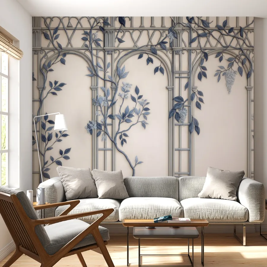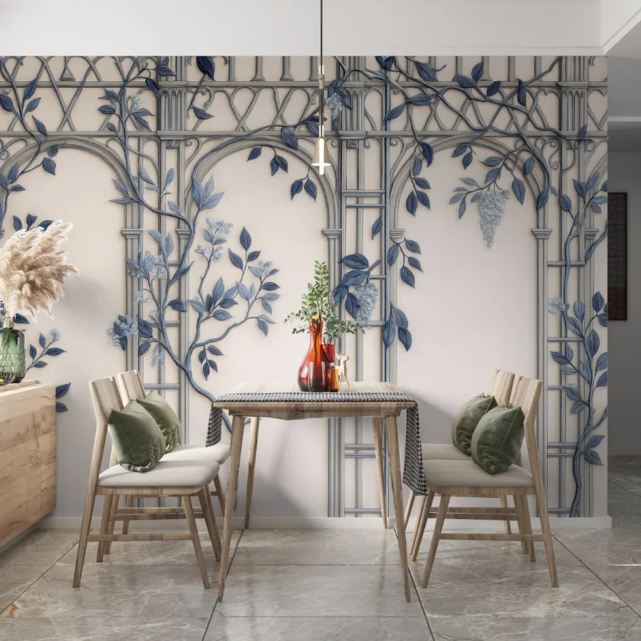 Klasik mimarinin asaletiyle doğanın zarafetini bir araya getiren bu duvar kağıdı, krem zemin üzerinde mavi yaprak ve sarmaşık detaylarıyla zamansız bir şıklık sunar. İnce işlenmiş kemer formu, duvarlara mimari bir derinlik kazandırırken; soft mavi tonlar mekâna huzurlu ve ferah bir atmosfer katar. Üç boyut etkisiyle öne çıkan gölgelendirmeler, sade dekorasyonlarda dahi sofistike bir etki yaratır. Bu tasarım, hem klasik hem modern tarzlara uyum sağlayan zarif bir sanat yorumudur.