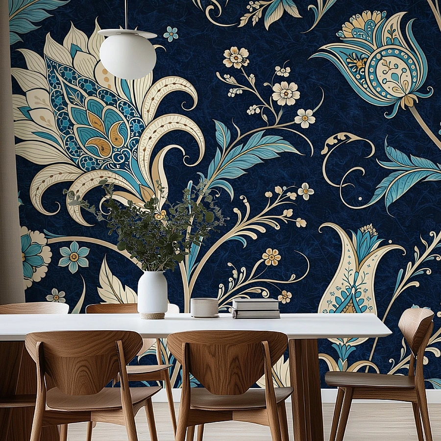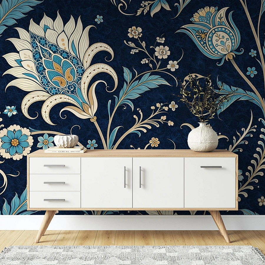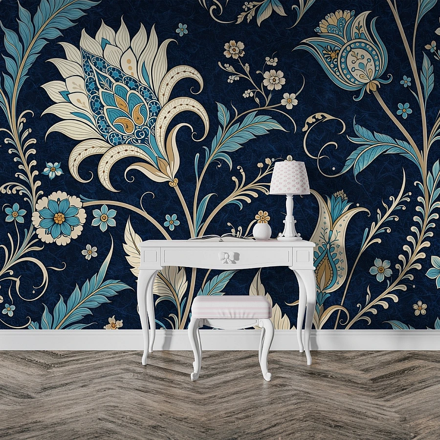 Derin lacivert zemin üzerinde hayat bulan zarif kıvrımlı çiçek ve yaprak motifleriyle tasarlanan bu Osmanlı desenli duvar kağıdı, mekâna sanatsal bir ihtişam kazandırır. Turkuaz, krem ve altın tonlarının ince detaylarla işlenmiş kompozisyonu, duvar yüzeyinde geleneksel estetiği modern bir yorumla sunar.