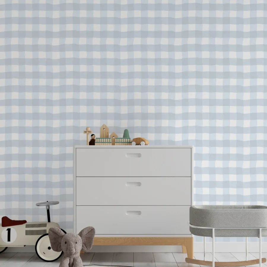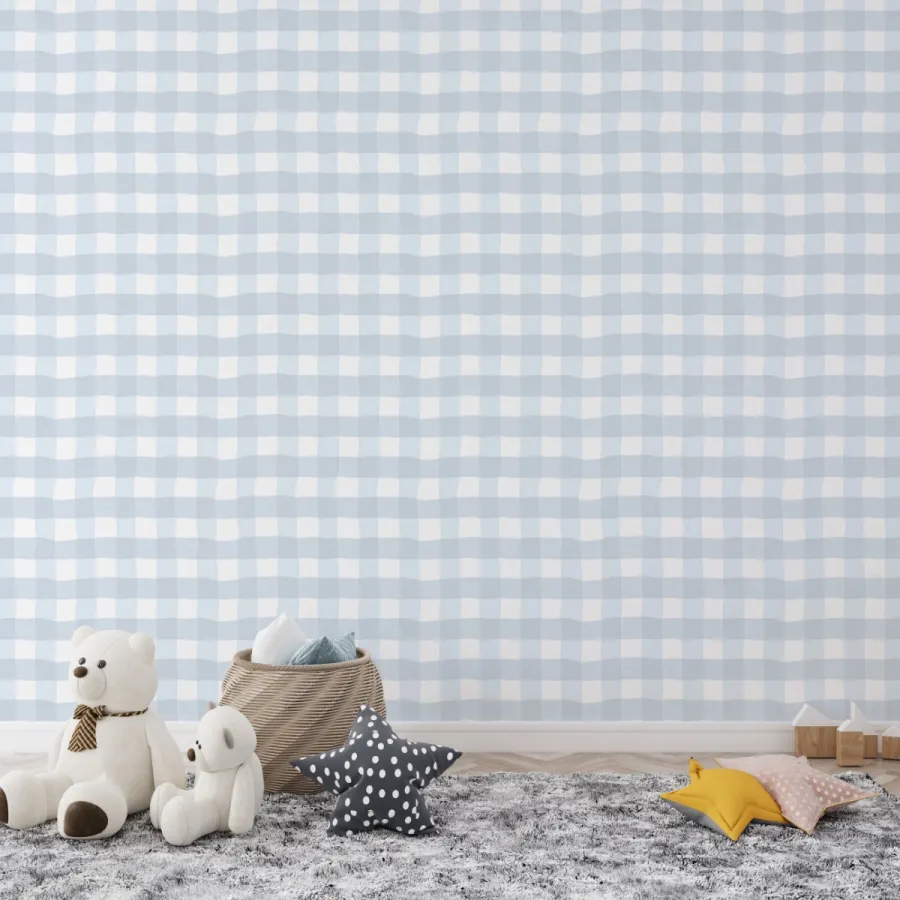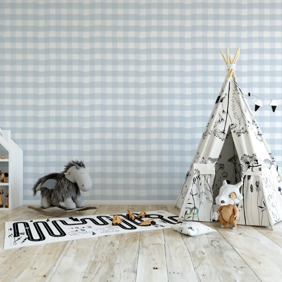 Bu pastel mavi kareli duvar kağıdı, İskandinav tarzı beyaz veya açık ahşap mobilyalarla mükemmel uyum yakalar.