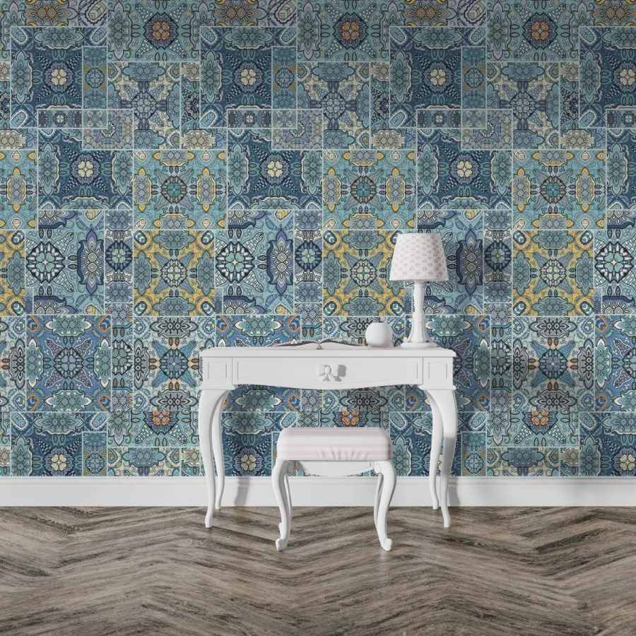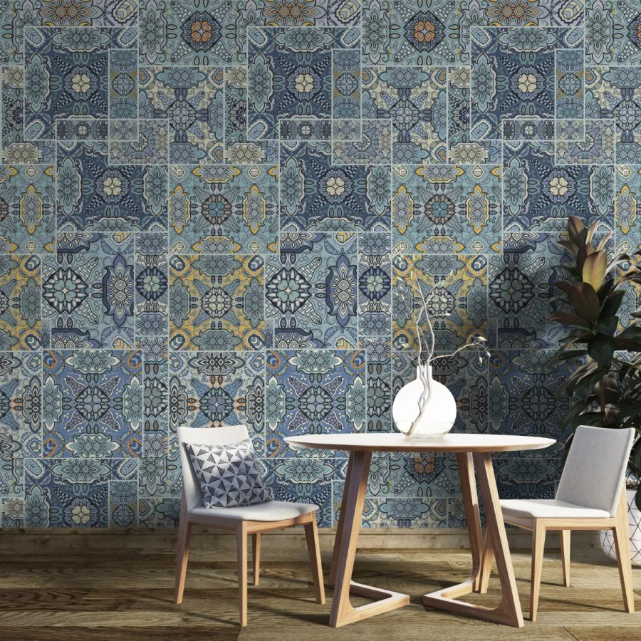 Akdeniz’in renkli mozaiklerinden ilham alan bu duvar kağıdı, geleneksel seramik desenlerini modern bir dokuyla buluşturur. Mavi, lacivert ve sarı tonlarının armonisiyle bezenmiş geometrik motifler; duvarlarda canlı, sıcak ve davetkâr bir atmosfer oluşturur. Her bir karo deseni el işçiliği hissi veren detaylara sahiptir ve mekâna nostaljik bir zarafet kazandırır. Bu tasarım, hem bohem hem klasik dekorasyon stillerine Akdeniz’e özgü rahatlık ve ışıltı getirir.