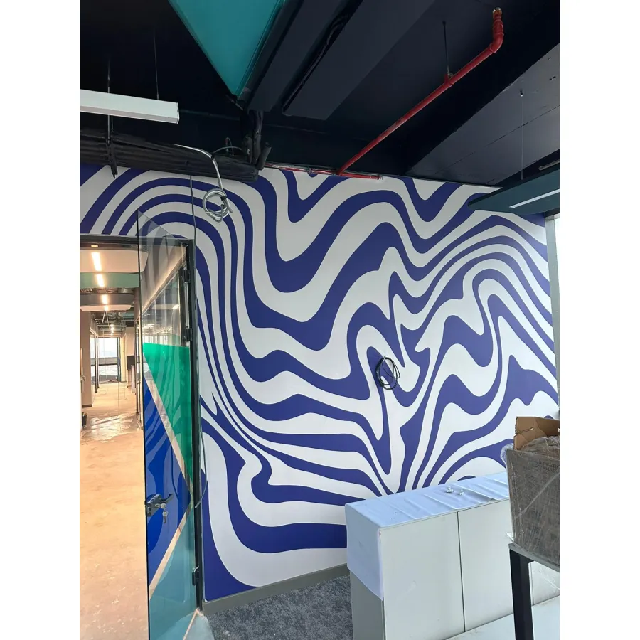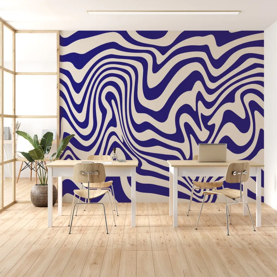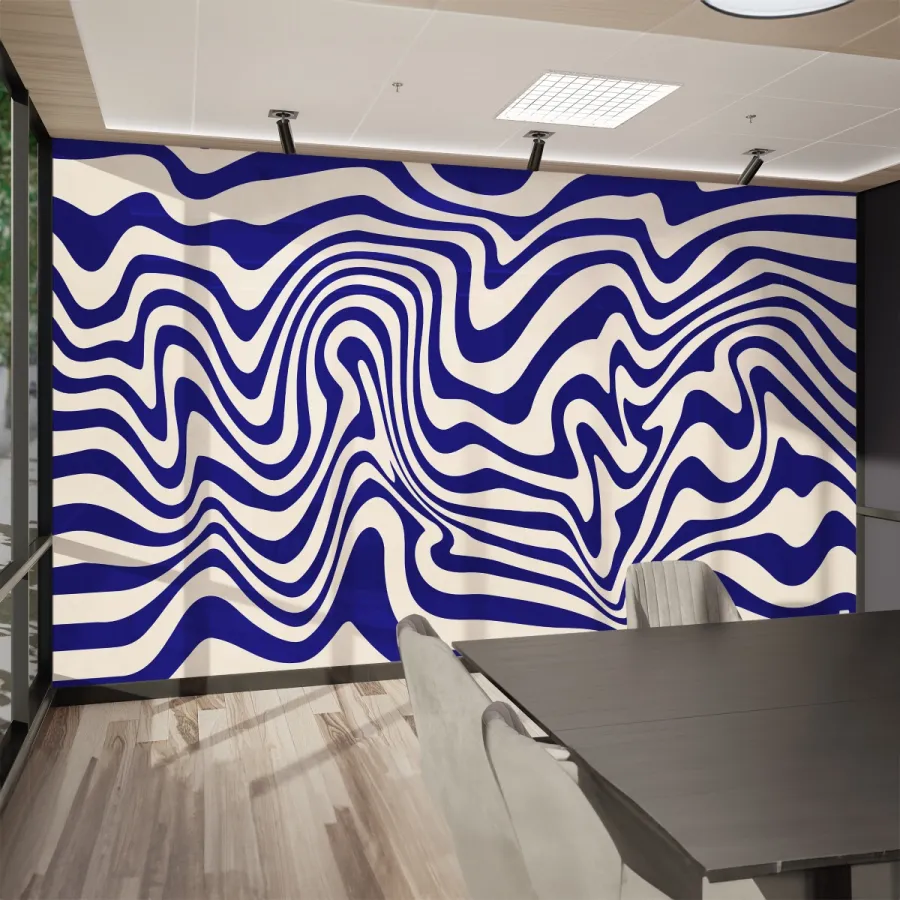 Bu tasarım, lacivert ve beyazın keskin kontrastıyla oluşturulan optik illüzyonu duvarlara taşıyor. Akışkan çizgiler, su yüzeyinin rüzgârla titreşen formunu anımsatırken; mekâna hareket, dinamizm ve güçlü bir modernlik katıyor.