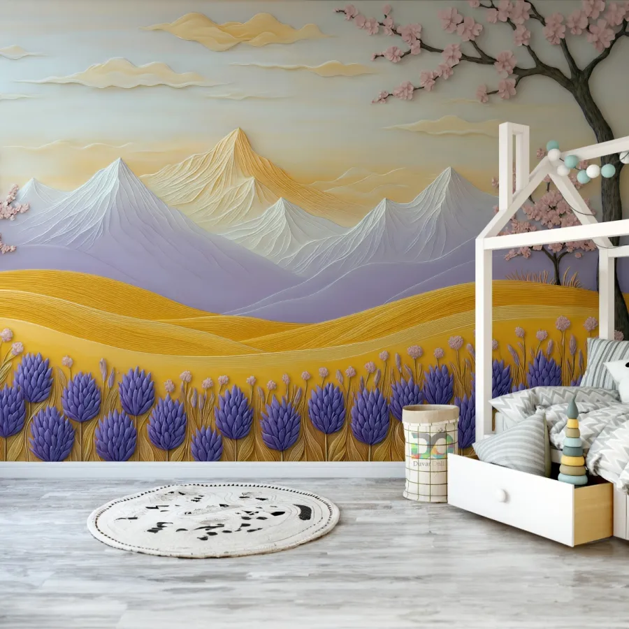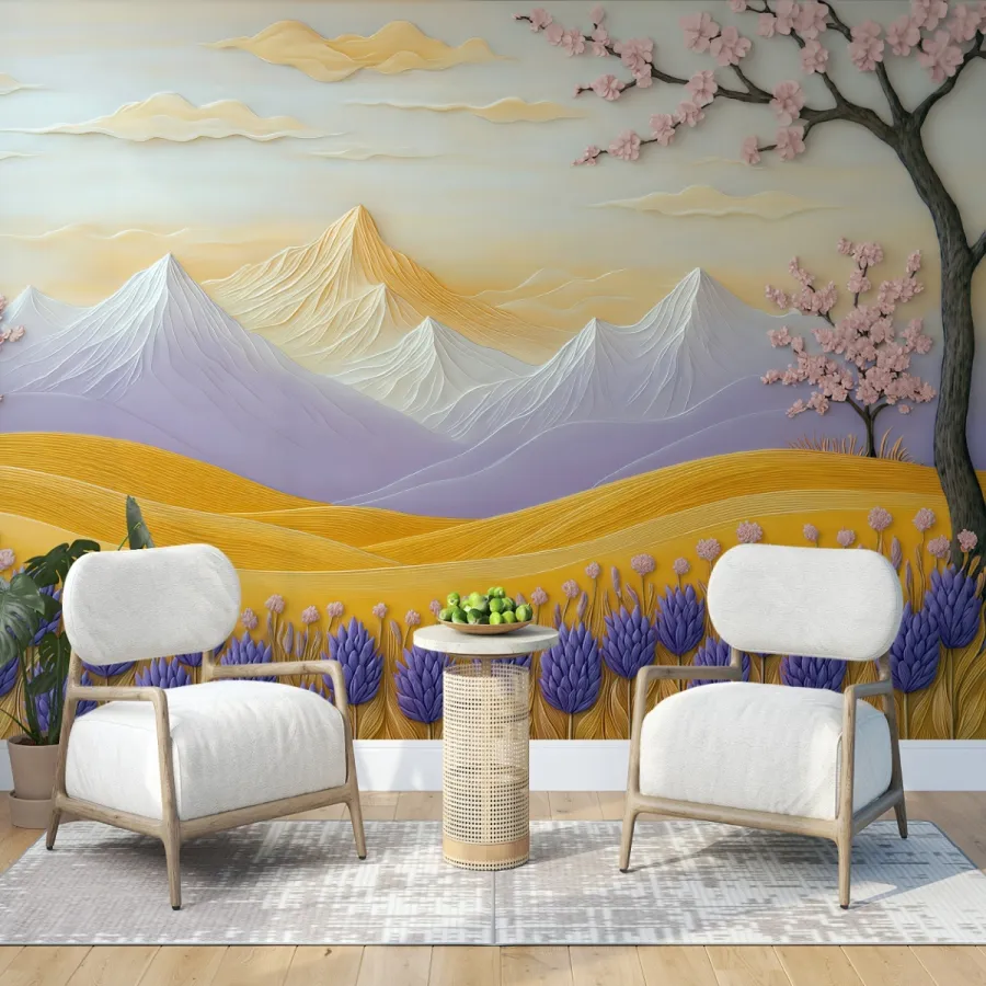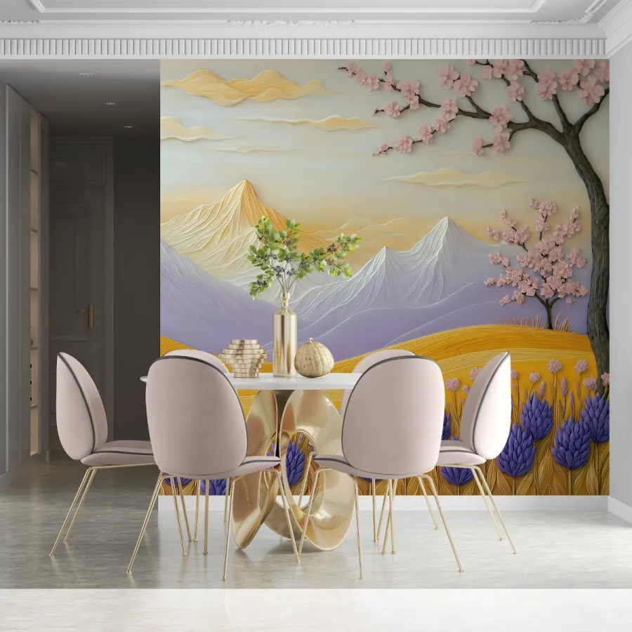 Bu masalsı sahnede, kabartma çizgilerle işlenmiş dağlar adeta rüzgârın dokunuşunu hatırlatırken; altın sarısı ovalar yaşam enerjisiyle parlıyor. Pembe çiçeklerle bezeli dallar, mekâna baharın en zarif büyüsünü getiriyor—sanki hafif bir esinti eşliğinde çiçeklerin kokusu odaya doluyormuş gibi.