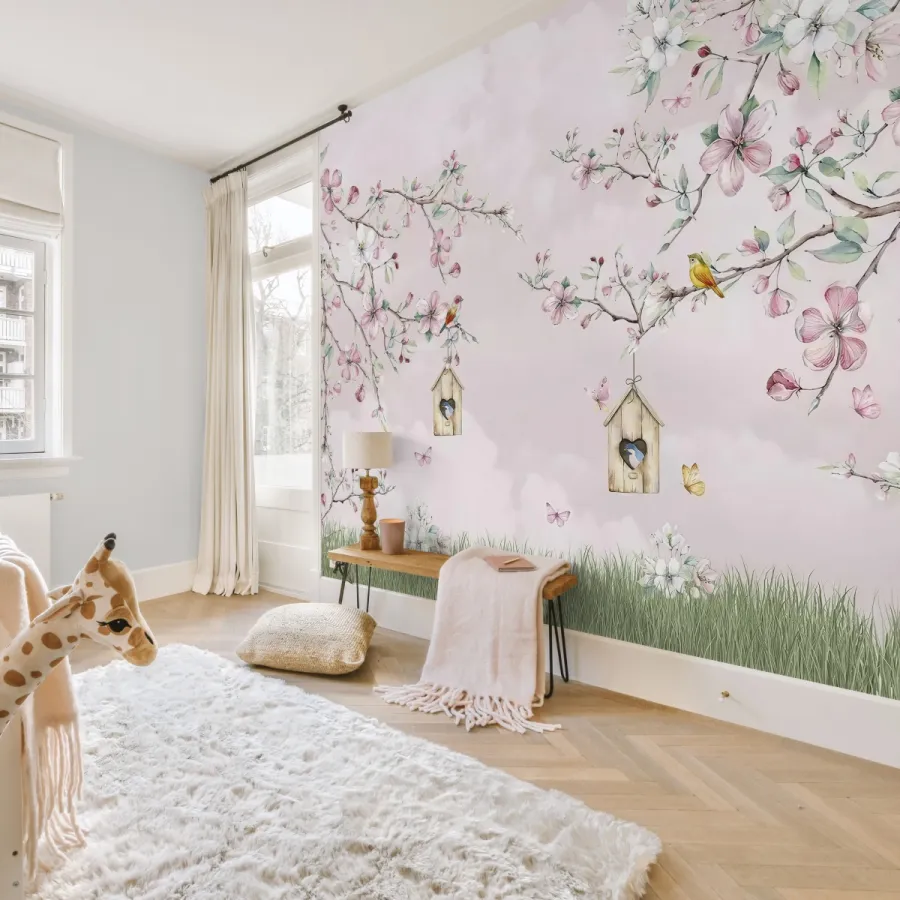 Pembe Çiçekli ve Kuş Desenli Çocuk Odası Duvar Kağıdı
