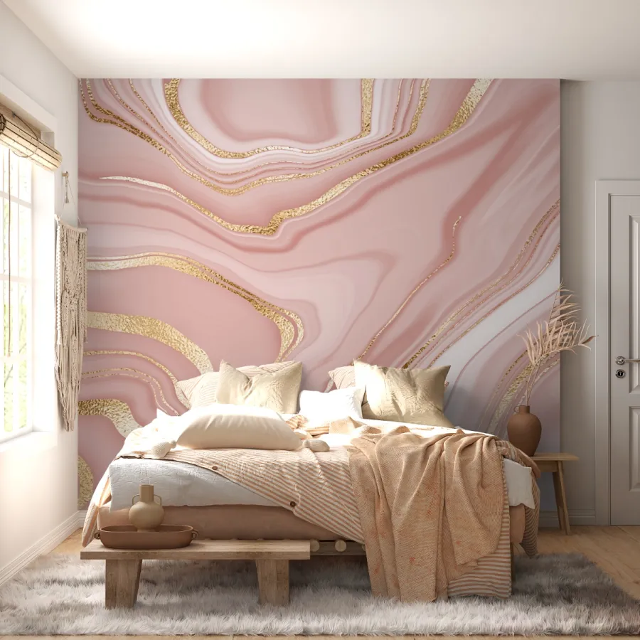 Yumuşak pembe tonlarının sütlü bir akışla birleştiği, altın damarların ise zarafetle yüzeyi kestiği bu tasarım; duvarınıza adeta parıltılı bir mücevher ışıltısı taşır.
