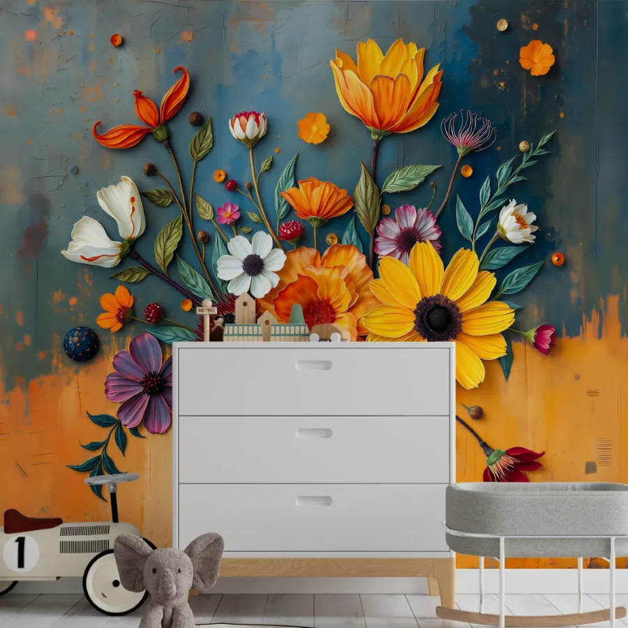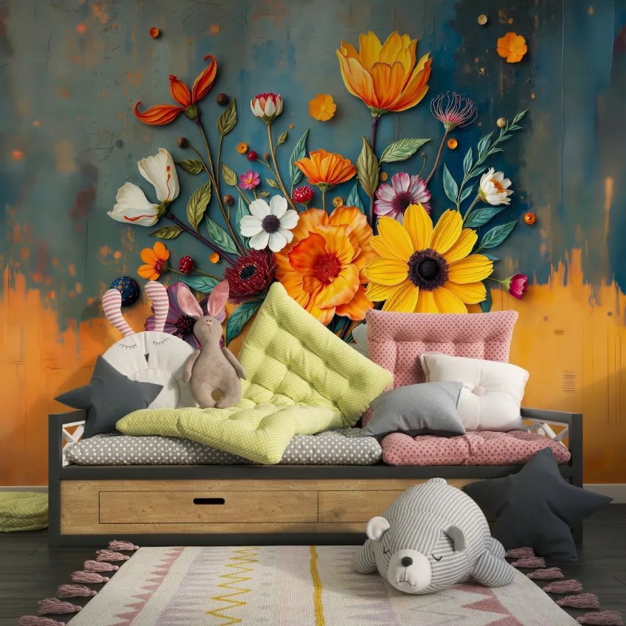 Turuncunun sıcaklığı, morun büyüsü, sarının enerjisi ve beyazın masumiyeti tek bir duvarın üzerinde nefes alıyormuş gibi duruyor. Kabartma dokular sayesinde her yaprak, her taç yaprak gerçek bir çiçeğin tazeliğini hissettirirken; arka plandaki renk geçişleri tasarıma masalsı bir derinlik katıyor.