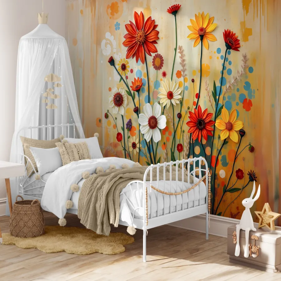 Kırmızıdan sarıya, beyazdan mora uzanan bu büyük ve canlı çiçekler; kabartma dokuları sayesinde neredeyse gerçekmiş gibi duvarın içinden yükseliyor. Sanki güneş ışığıyla uyanmış bir çiçek tarlası odanın içine taşmış da çocukların hayal gücüne renk katmak için sabırsızlanıyor.