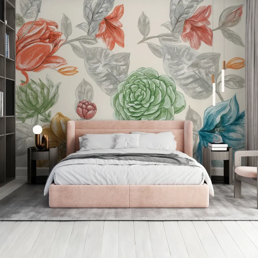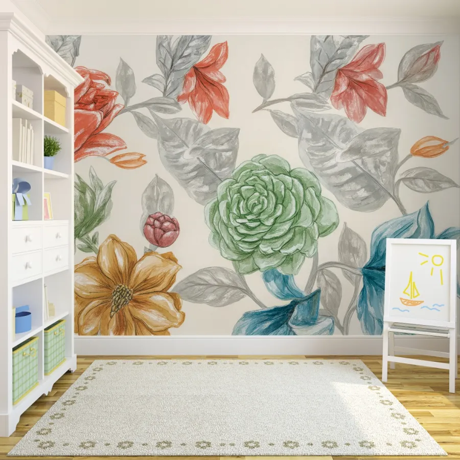 Canlı renklerle tasarlanmış çiçek desenli bu özel duvar kağıdı, çocuk odalarına neşe ve dinamizm katıyor. El çizimi hissi veren kırmızı, yeşil, sarı ve gri tonlardaki çiçekler, doğallığıyla odada huzurlu bir atmosfer oluşturuyor. Çocukların hayal dünyasını zenginleştiren bu tasarım, hem oyun alanlarına hem de yatak odalarına şık bir dokunuş getirir. Ayrıca kreş, anaokulu ve oyun merkezlerinde de kullanılarak pozitif ve eğlenceli bir ortam yaratılabilir.