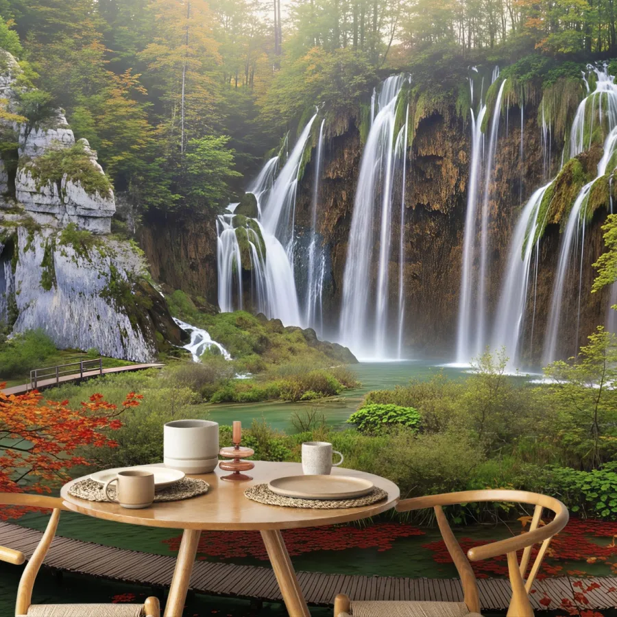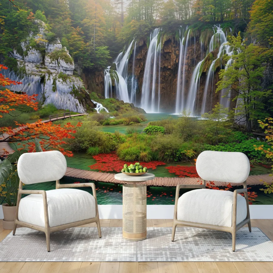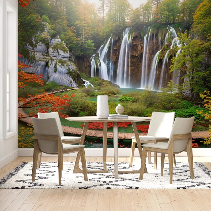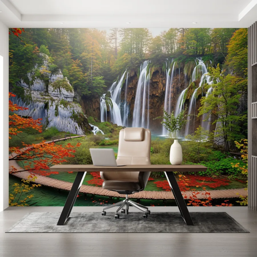 Doğanın en büyüleyici detaylarını duvarlarınıza taşıyan bu duvar kağıdı, görkemli şelaleler ve ahşap yürüyüş yolu ile dinginlik ve huzuru bir araya getiriyor. Yeşilin, suyun ve sonbahar renklerinin uyumu, mekâna derinlik ve canlılık katarken adeta doğanın kalbinde bir yolculuğa çıkıyormuş hissi uyandırır. Evlerde salon ve çalışma odalarında doğallığı öne çıkarırken, ofislerde ferah bir atmosfer oluşturur. Ayrıca spa merkezleri, yoga stüdyoları, otel lobileri ve kafeler için de doğayla iç içe estetik bir dekorasyon seçeneği sunar.
