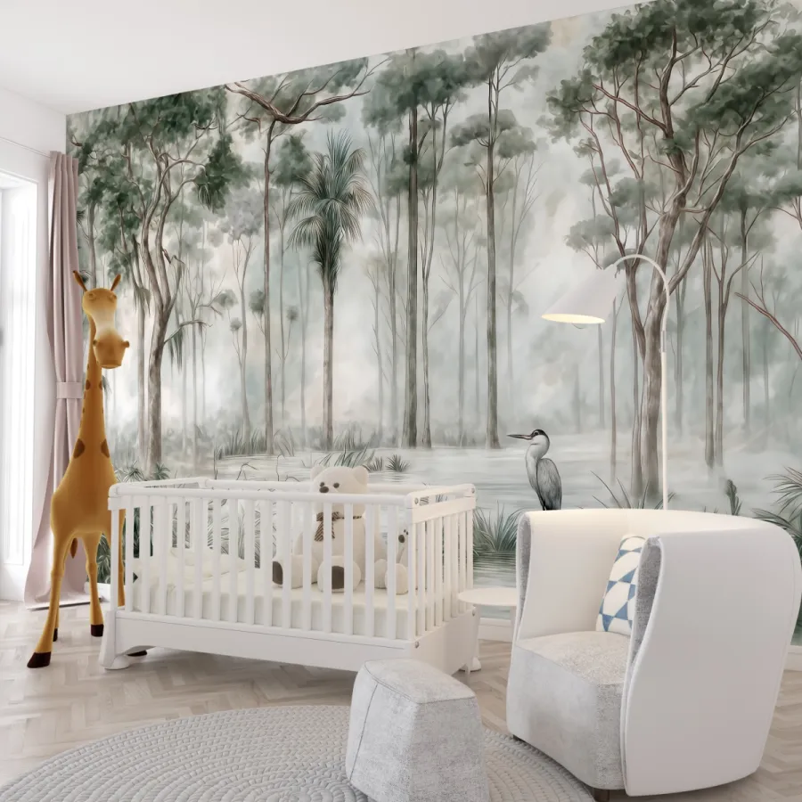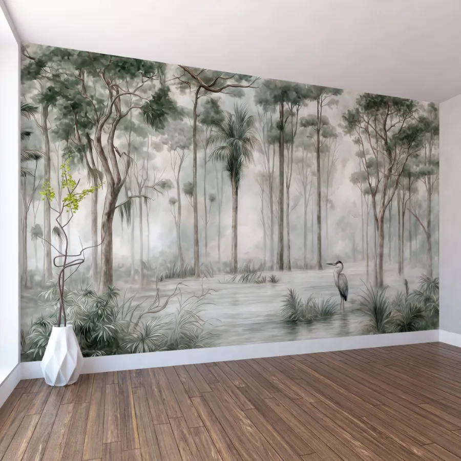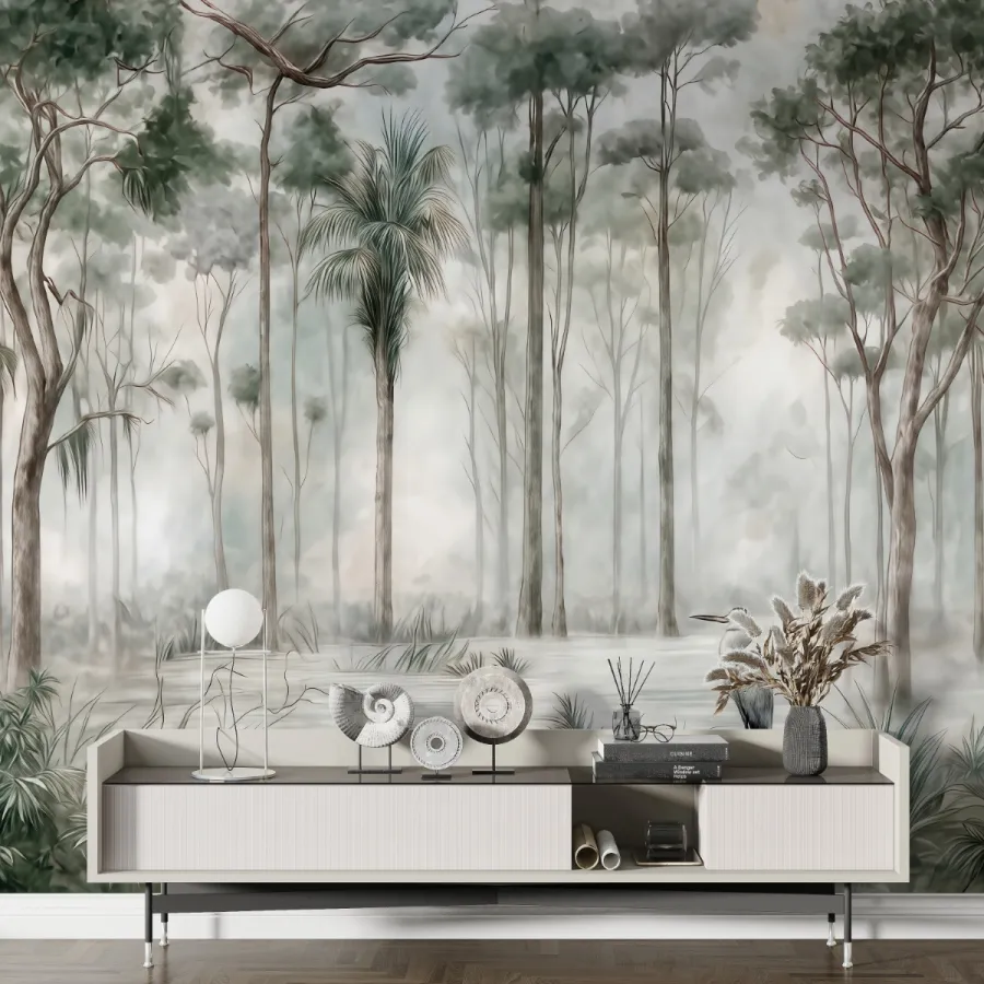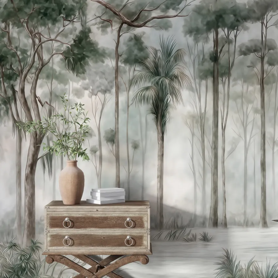 Doğanın mistik güzelliğini zarafetle birleştiren bu tasarım, sislerin arasında uzanan tropik ağaçların sakinliğini duvarlarınıza taşır. Su yeşili, bej ve gri tonların kusursuz uyumu, mekânınıza huzur ve ferahlık kazandırır. İnce fırça darbeleriyle işlenmiş detaylar, adeta akvarel bir tablo hissi yaratır. Bu duvar kağıdı, doğallığı ve dinginliği aynı anda sunarak modern ve minimalist dekor anlayışına sanatsal bir dokunuş ekler.