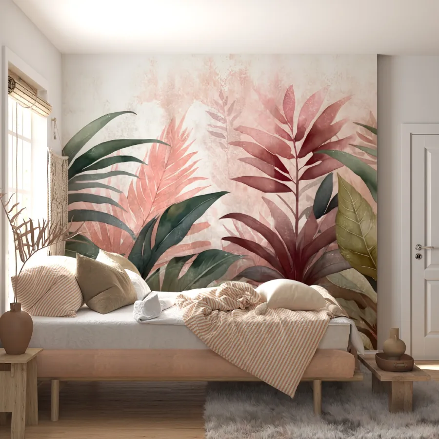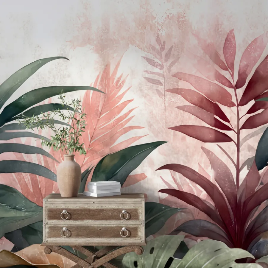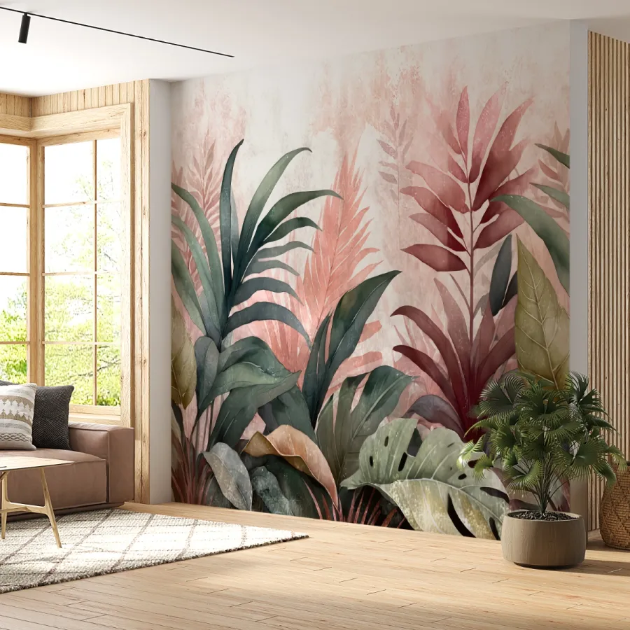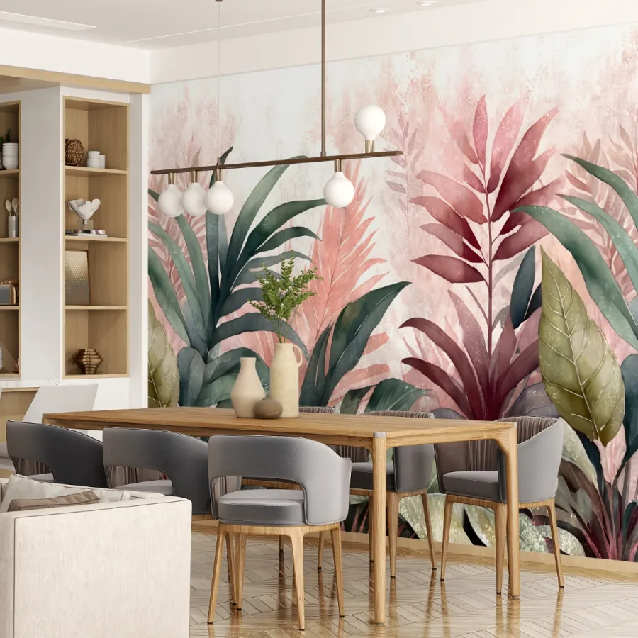 Doğal zarafetin en yumuşak hâlini yansıtan bu duvar kağıdı, pastel tonlardaki tropikal yapraklarıyla mekâna taze, sakin ve zarif bir enerji getirir. Pembe, yeşil ve bej tonlarının yumuşak geçişleri, duvarda akvarel bir etki yaratarak ortamı ferahlatır. Modern ve minimalist çizgilerle bütünleşen bu tasarım, yaşam alanlarını huzurlu bir bahçeye dönüştürür. Her detayında doğanın narinliğini, modern iç mekânların sıcak zarafetiyle buluşturur.