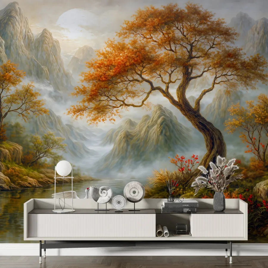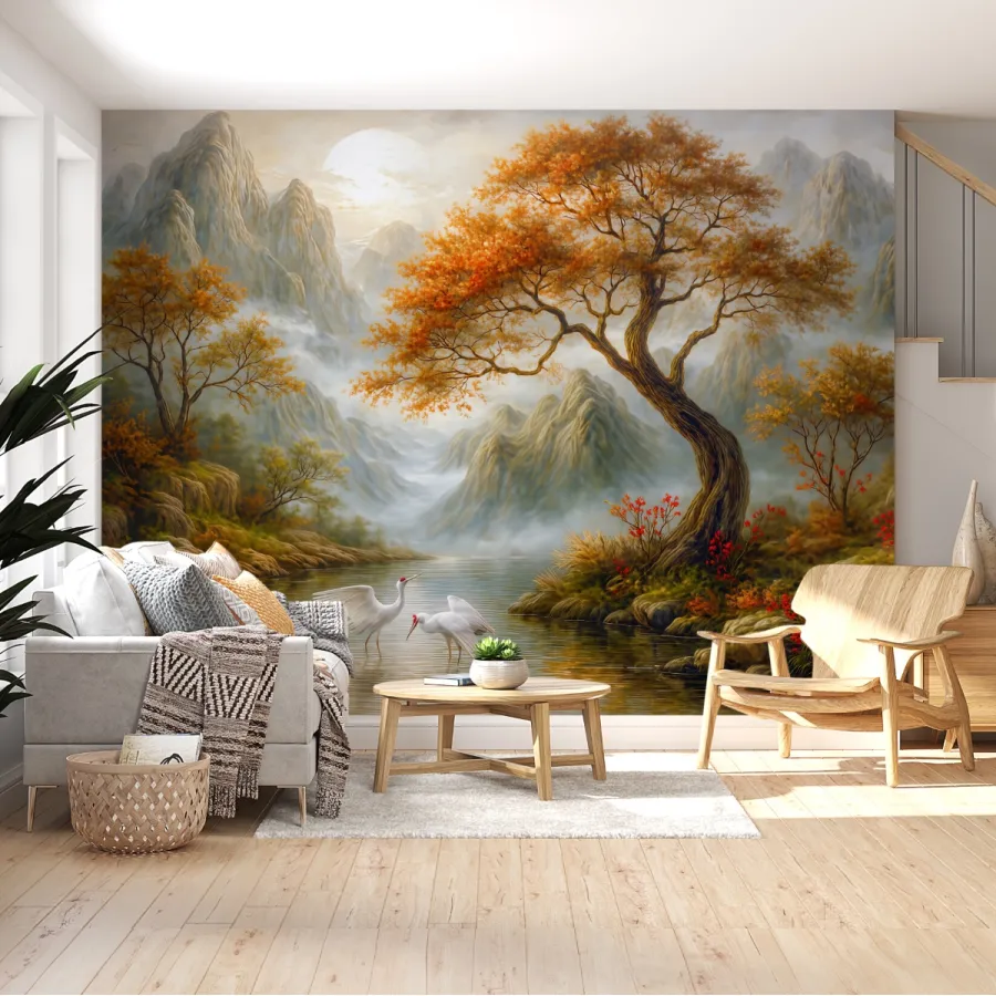 Doğanın büyüleyici sessizliğini duvarlarınıza taşıyan bu sanatsal duvar kağıdı, sisli dağların ve dingin bir gölün kıyısında duran zarif ağaç figürleriyle kusursuz bir kompozisyon oluşturur. Altın ve turuncu yaprak tonları, sabah güneşinin huzurlu ışıklarıyla birleşerek mistik bir atmosfer yaratır. Göl kenarında duran turnalar, doğayla uyumun ve zarafetin simgesi olarak tasarıma romantik bir ruh kazandırır. Bu model, doğayı bir tablo estetiğiyle mekânlara taşır ve bulunduğu ortama huzur, zarafet ve derinlik katar.