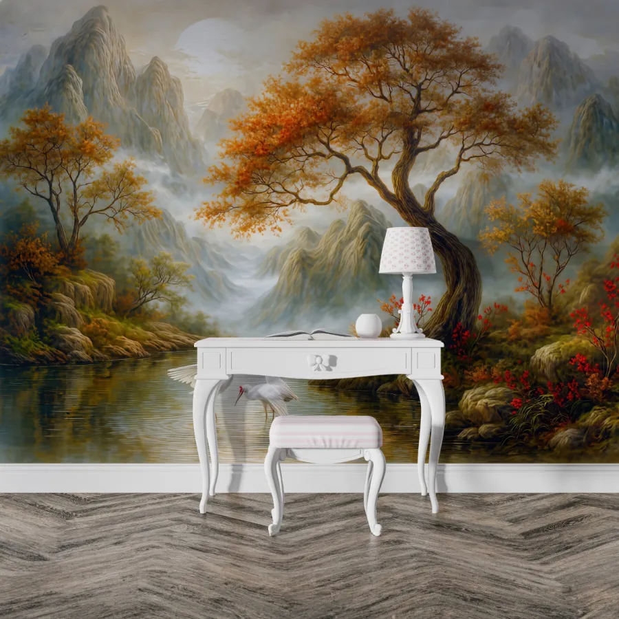 Sonbahar Manzaralı Dağ ve Göl Temalı Sanatsal Duvar Kağıdı