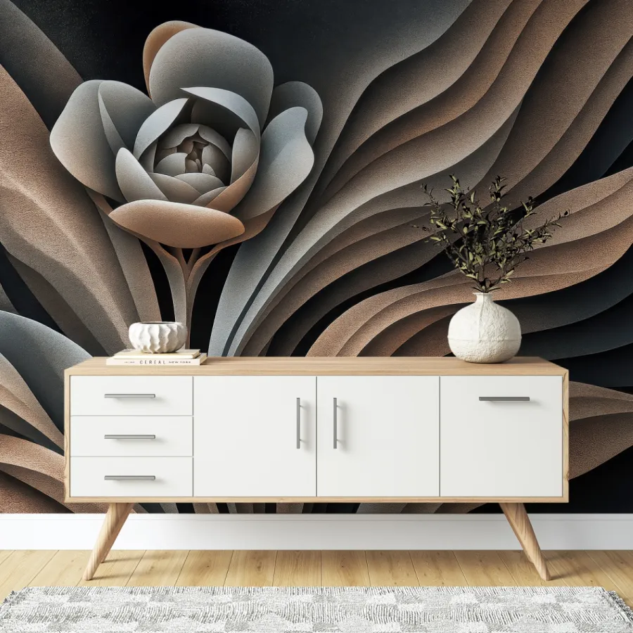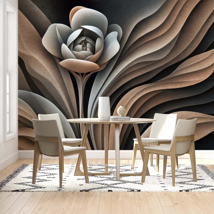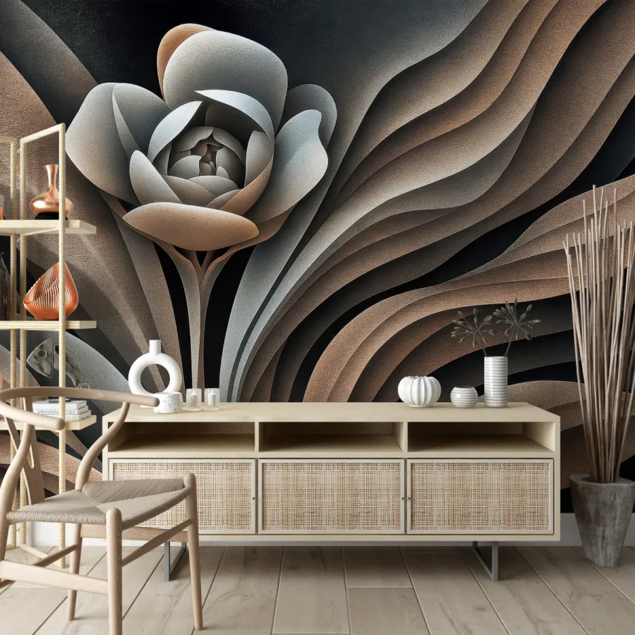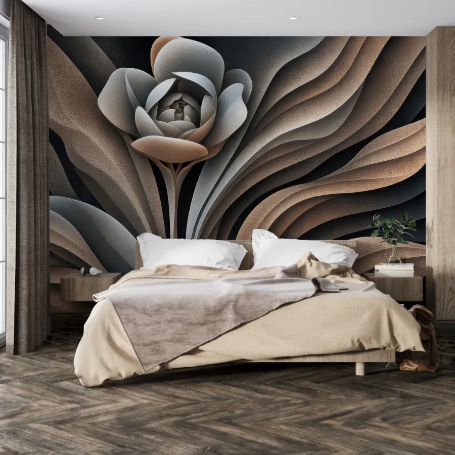 Sanat ve zarafetin kusursuz birleşimi… Bu tasarımda devasa bir çiçeğin soyut formu, dalgalı yüzeylerle buluşarak duvarı yaşayan bir sanat eserine dönüştürür. Toprak tonlarının sıcak geçişleriyle derin gölgeler, üç boyutlu bir kıvrım hissi yaratır. Her katman, ışığın yönüne göre hareket eden bir dalga gibi görünür; bu da mekâna sürekli değişen bir dinamizm kazandırır.