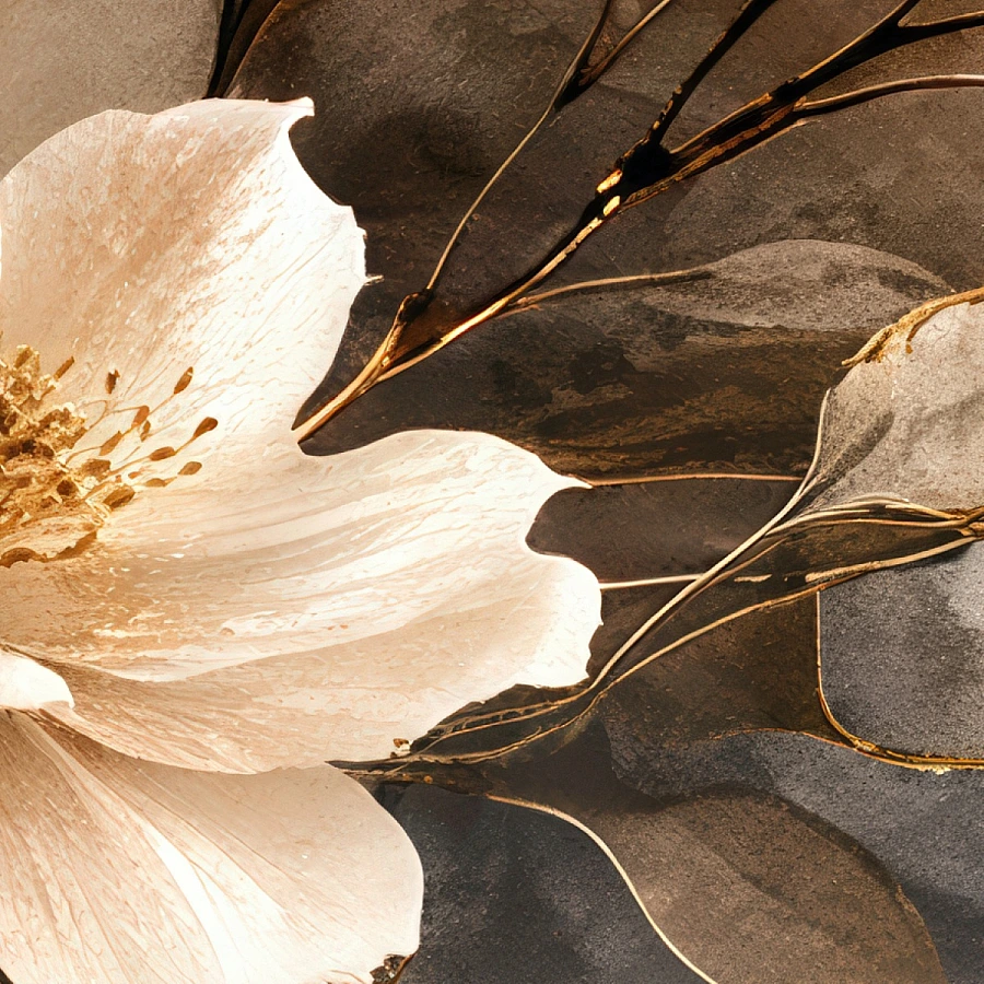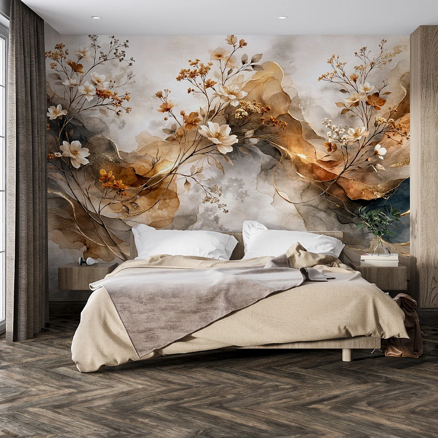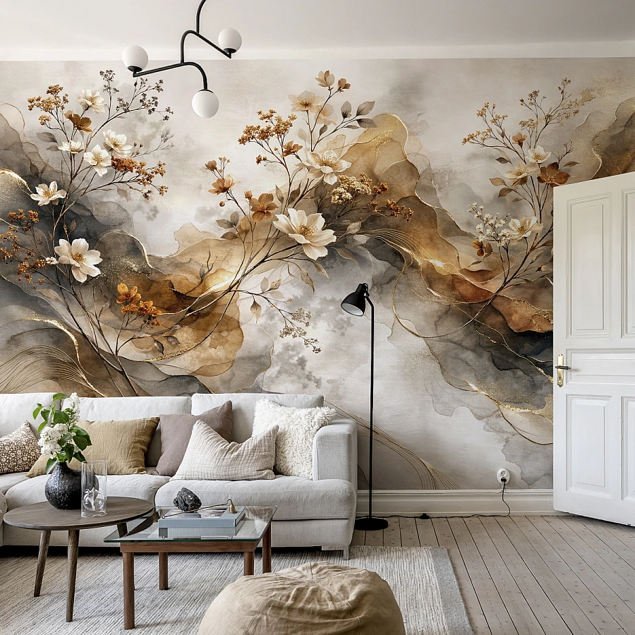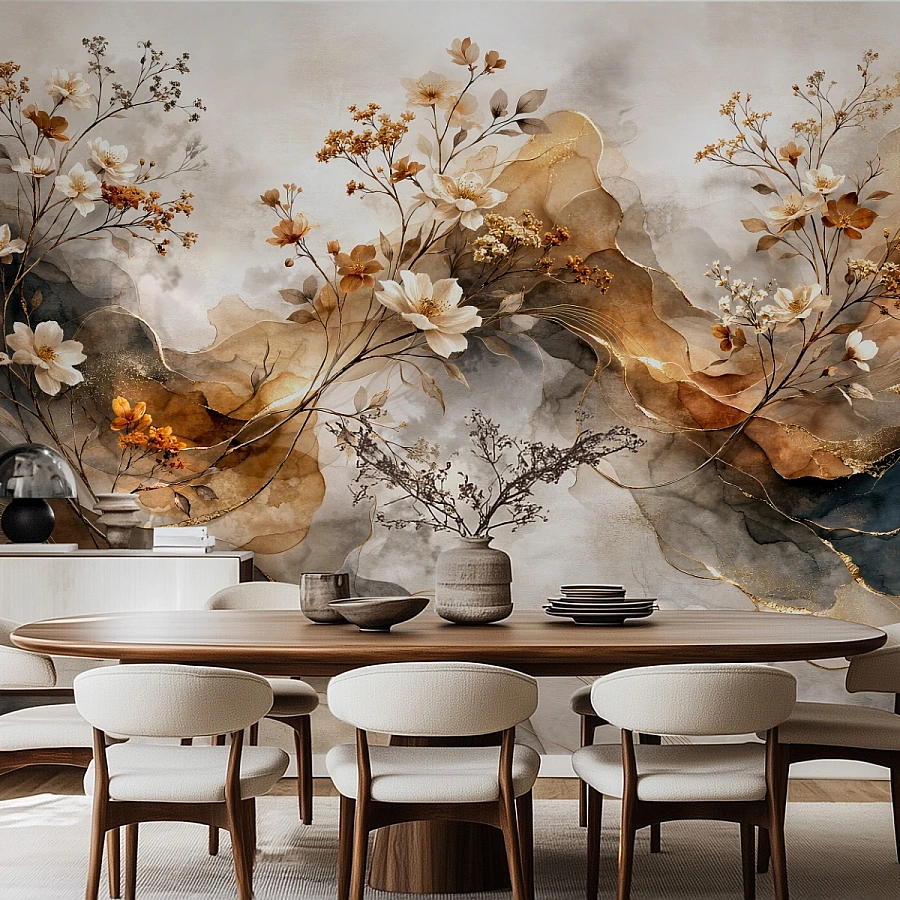 Su renk geçişleriyle harmanlanmış soyut zemin üzerine işlenen zarif çiçek kompozisyonu, duvar yüzeyinde tablo etkisi yaratır. Krem, karamel ve toprak tonlarının akışkan formu; altın yansımalarla birlikte mekâna sıcak, sanatsal ve sofistike bir derinlik kazandırır.