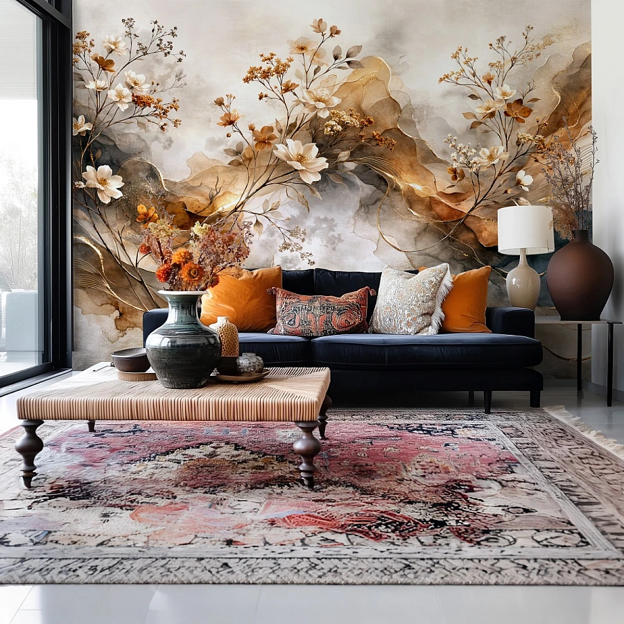 Organik lekesel geçişler ile ince dal ve çiçek detaylarının dengeli birlikteliği sayesinde desen hem güçlü hem de yumuşak bir etki sunar. Geniş yüzeylerde mural hissi oluşturarak alanı sıradan bir duvardan çıkarır ve dekorasyonun ana odak noktası haline getirir.