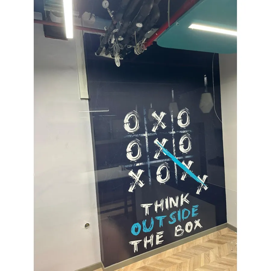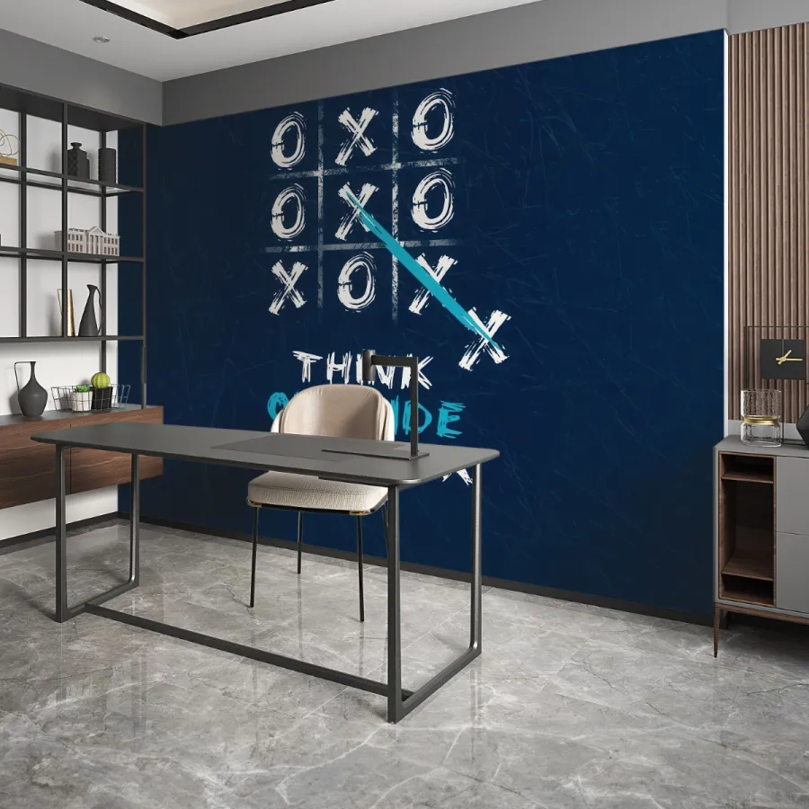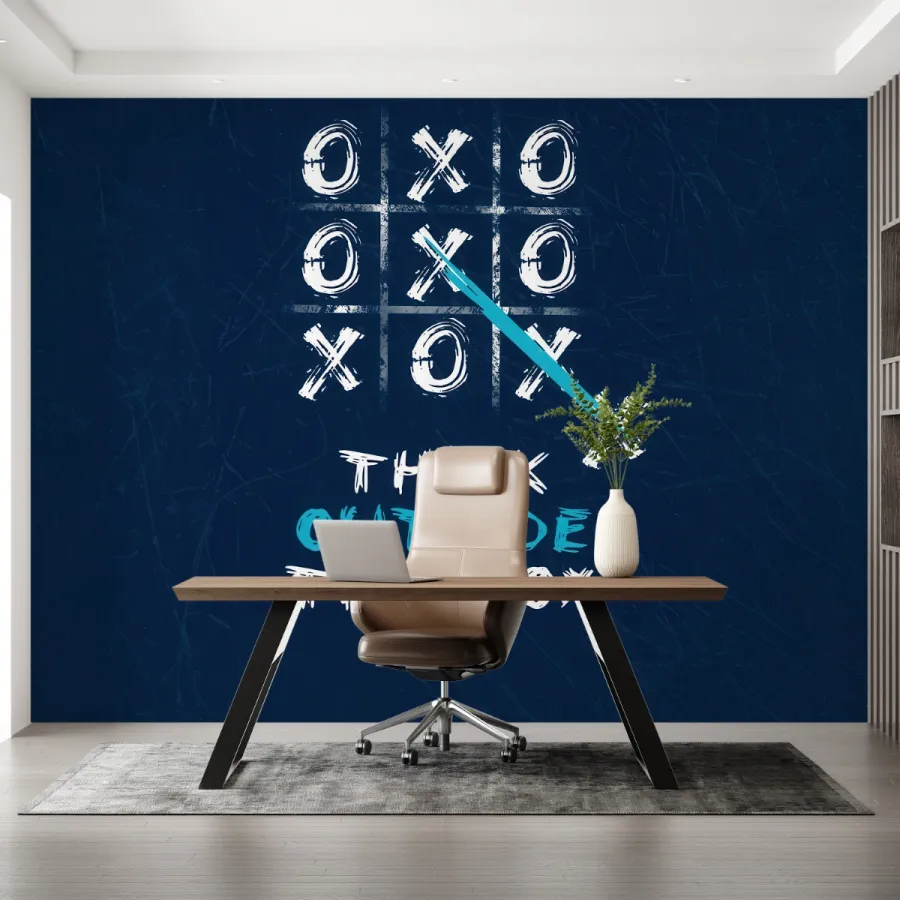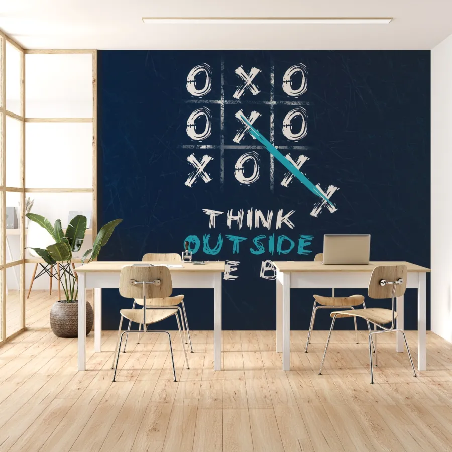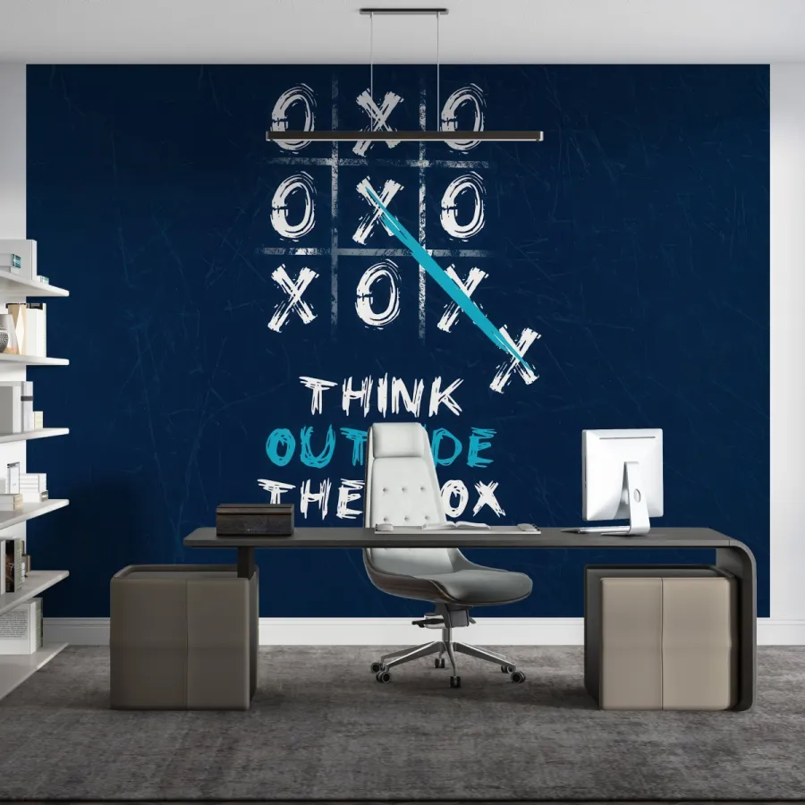 Lacivert fonun üzerinde, karalama etkili X–O dokuları ve çarpıcı turkuaz çizgi; duvarda yaratıcı zekânın tam merkezde olduğu bir sahne kurar. “Think Outside the Box” mesajı, sadece yazı olarak değil, görsel kavrayışı da harekete geçiren güçlü bir metafor olarak tasarıma işlenmiştir.