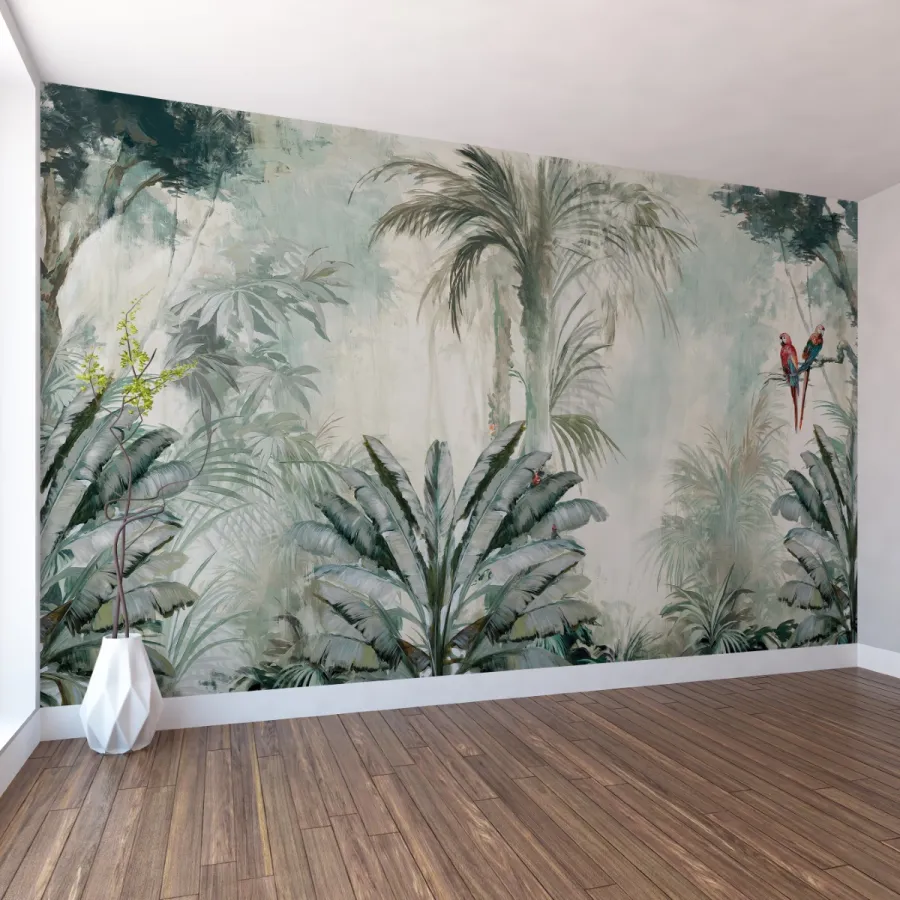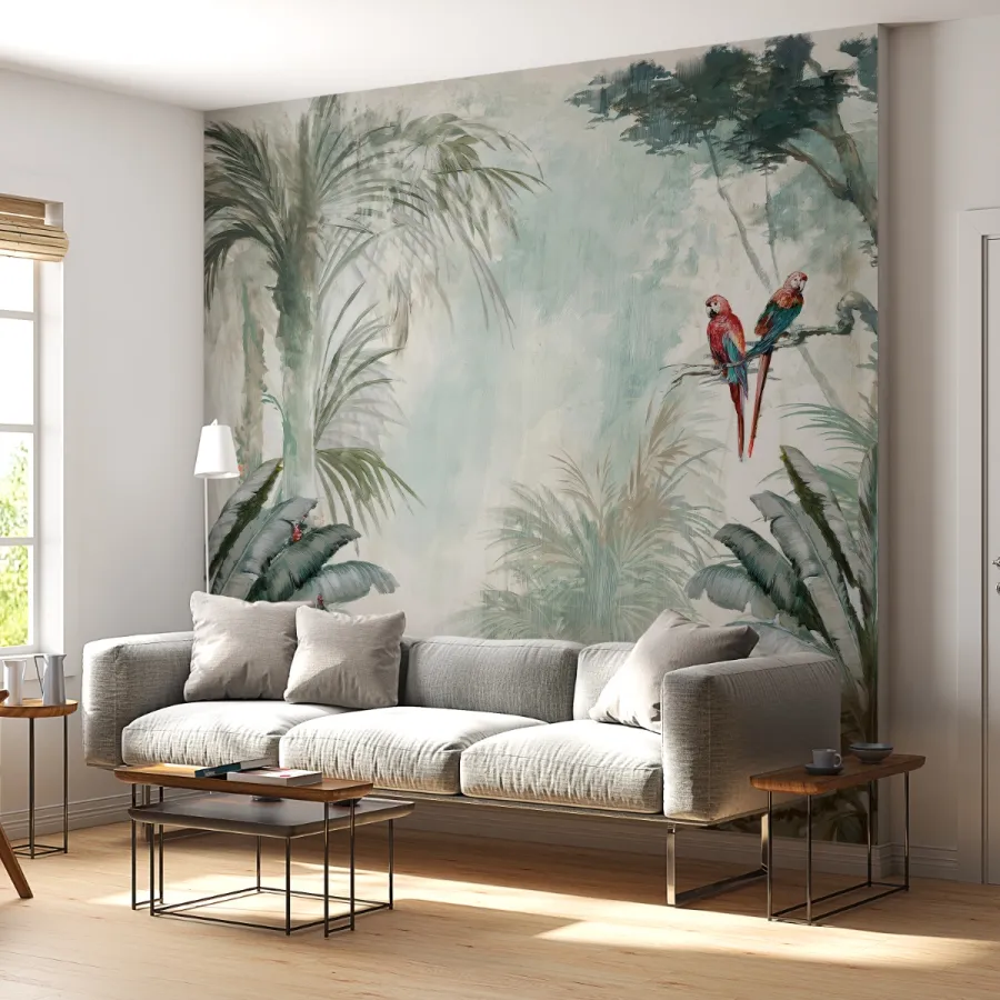 Bu tasarım, palmiye ve geniş yapraklı bitkilerin pastel yeşillerle dans ettiği dingin bir tropik sahneyi duvarlara taşır. Arka plandaki sisli atmosfer, mekâna hem ferahlık hem de sanatsal bir yumuşaklık katar. İncecik fırça dokuları, resmin içinde dolaşan hafif rüzgâr hissi yaratırken; dalın ucundaki papağanlar tasarıma canlı bir doğa hikâyesi ekler.