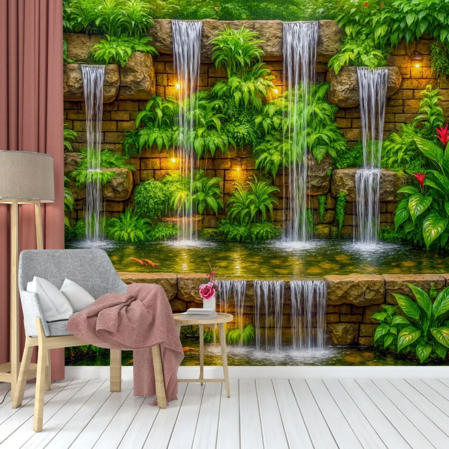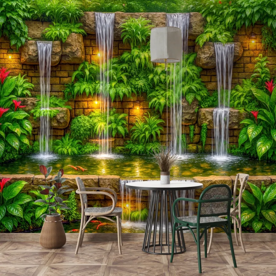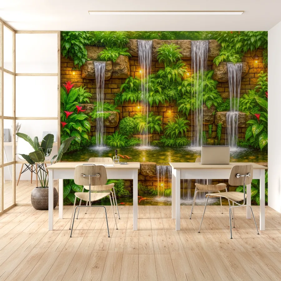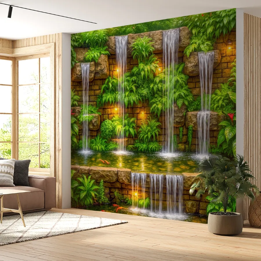 Canlı tropik yeşiller, taş duvarlar ve huzur veren şelale akışlarıyla oluşturulmuş bu 3D duvar kağıdı, doğanın enerjisini iç mekânlara taşıyor. Su damlalarının ve bitki yapraklarının yüksek çözünürlüklü detayları, gerçeklik hissini en üst seviyeye çıkarırken; duvar yüzeyine derinlik ve ferahlık kazandırır. Göl üzerinde süzülen turuncu Japon balıkları ise sahneye huzurlu bir yaşam enerjisi katar. Ayrıca doğasever ev dekorasyonlarında tazelik ve denge unsuru olarak kullanılabilir.