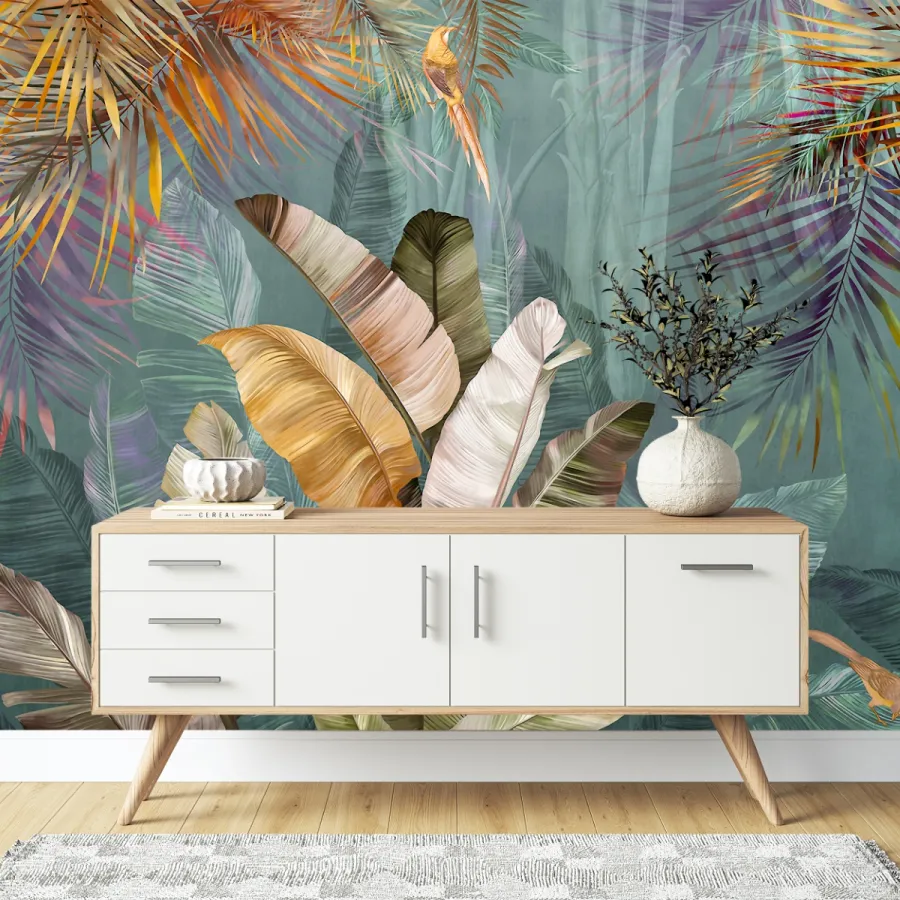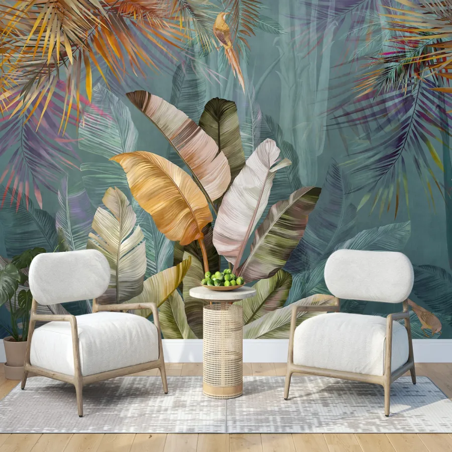 Tropikal Yaprak ve Egzotik Kuş Desenli Modern Duvar Kağıdı
