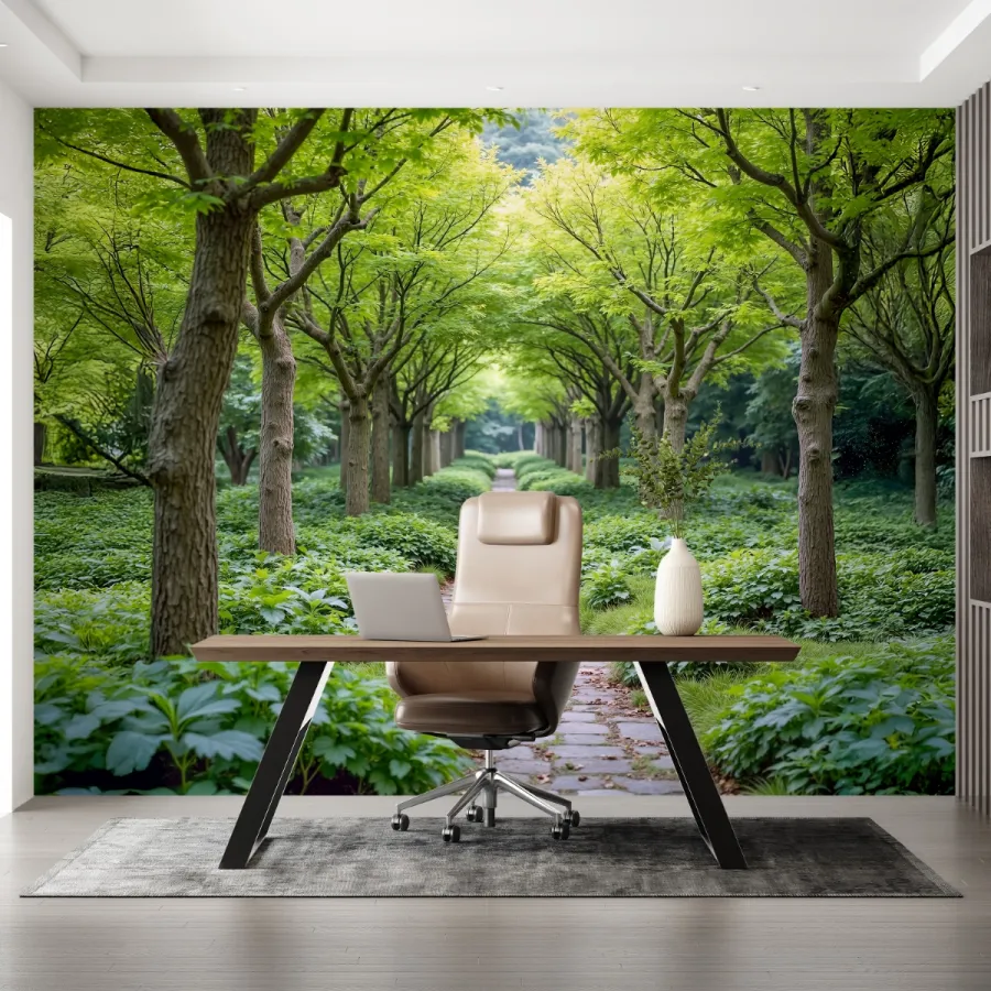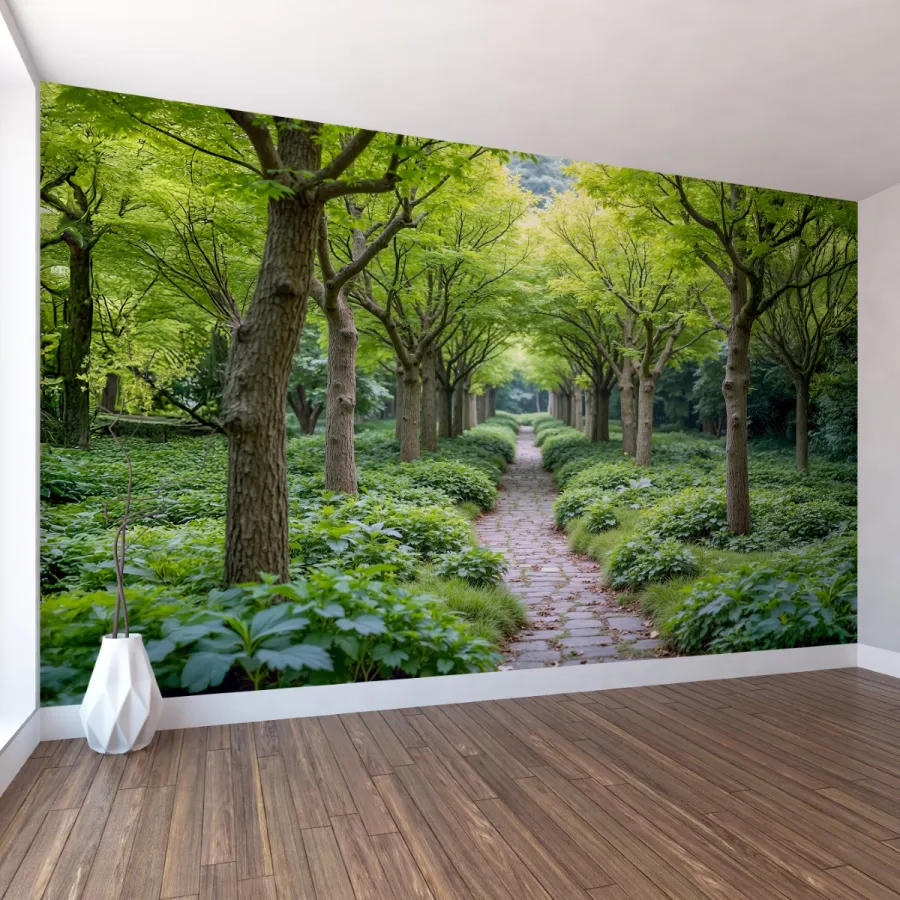Yeşil Ağaçlı Orman Yolu Manzara Desenli 3D Duvar Kağıdı